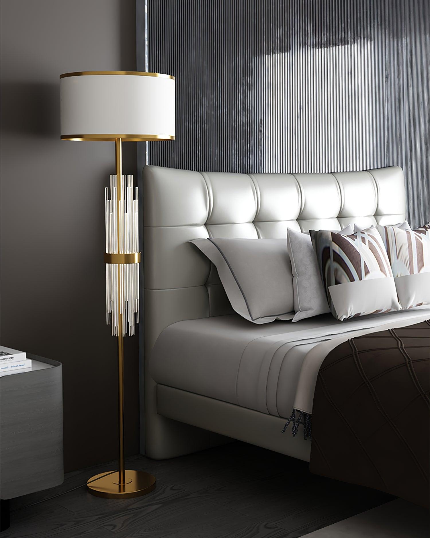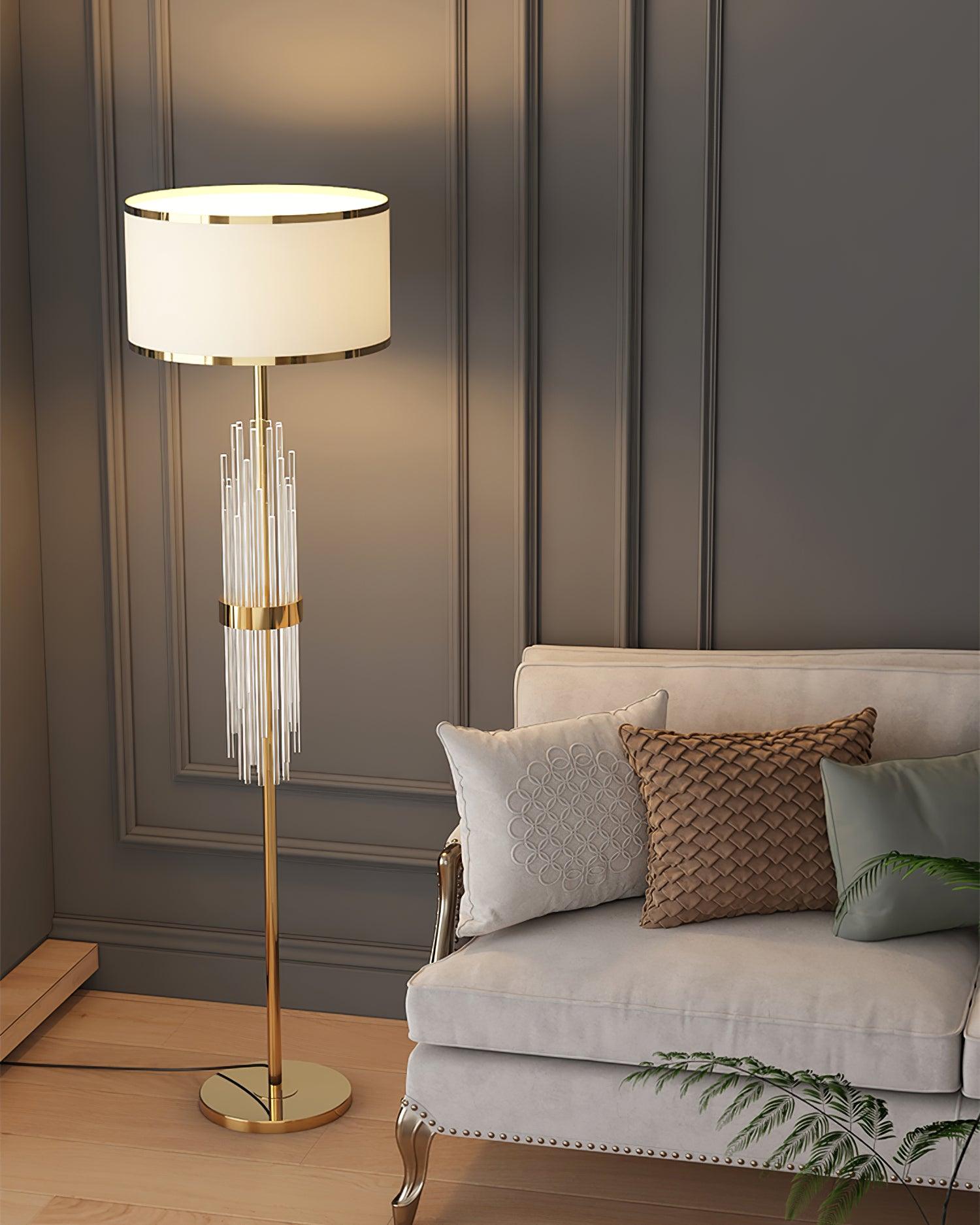 Add a conversation-starter to your living room or bedroom - guests won't be able to take their eyes off the clear and linear design. all garnished with a gilded metal and white fabric lampshade! Talk about dazzling!
