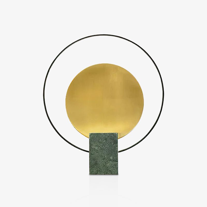 For a mix of industry trends with modern fashion. this table lamp features a simple yet striking styled metal hoop with a geometric disc in an aged gold finish. a slim black base. and with an inline switch.