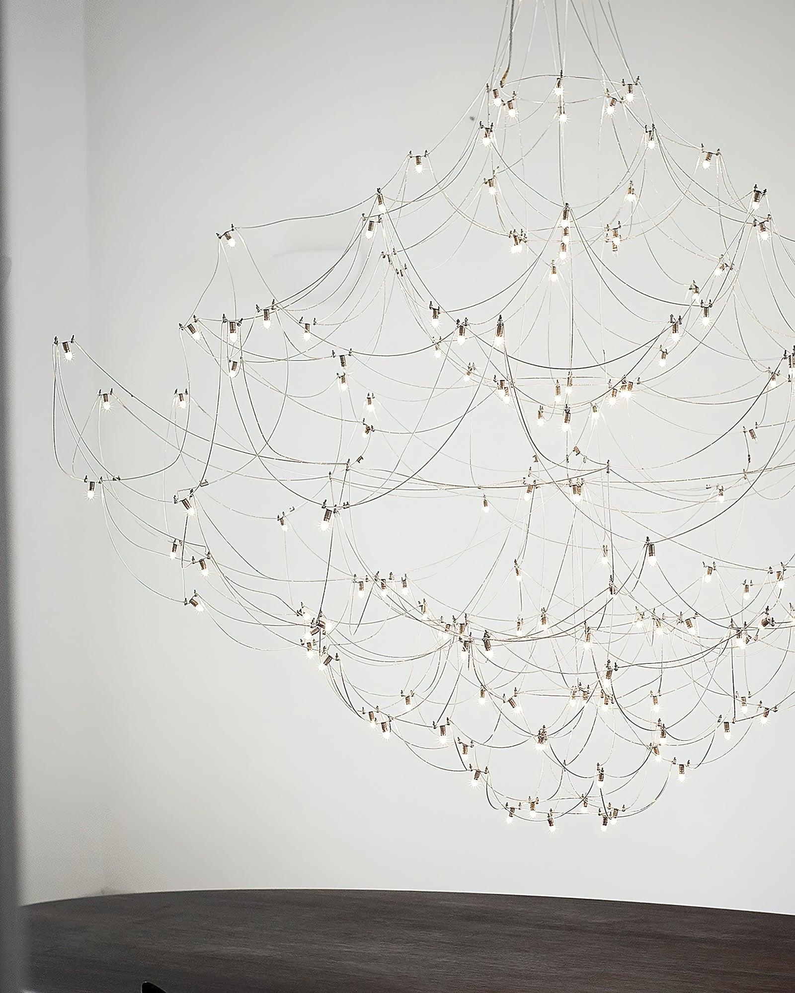 Perfectly brightens any area while adding a touch of luxury and sophistication. Stainless steel with a chrome finish is bent and assembled to form the structure of this chandelier. LEDs fixed in filaments bring an elegant ambience to your environment. creating the illusion that a swarm of fireflies are stunningly lighting up the space. Adds a beautiful and functional element to a stylish living room or hotel room. leaving a stunning impression on all visitors.