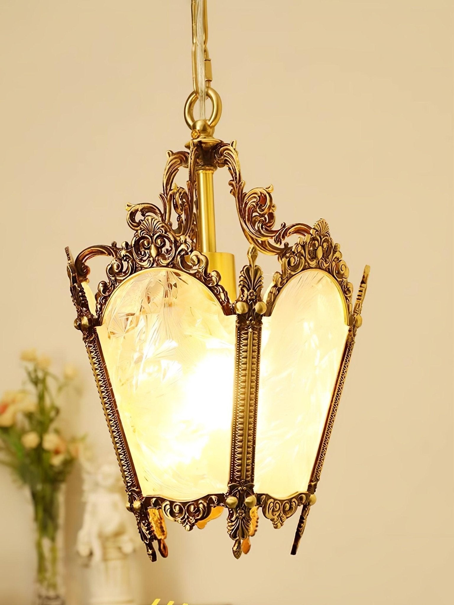 Encased within the ornate brass is a series of glass panes. carefully cut to complement the metalwork's regal design. These glass panels diffuse the light into a soft. ambient glow that enhances the lamp's vintage appeal. As light filters through. it creates a dance of luminosity and shadow that breathes life into the surrounding space.