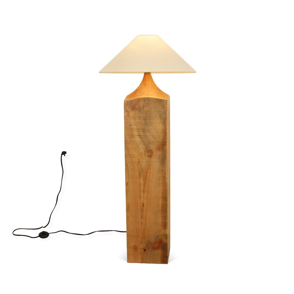 This floor lamp features a base of beautifully aged wood that exudes a sense of timeless stability and organic appeal. The column. with its natural imperfections and tactile surface. supports a slender metallic fixture that gracefully transitions into the realm of modern elegance. Topped with a textured fabric shade. the light it casts is subtly diffused. creating an ambiance reminiscent of a forest bathed in the gentle light of dawn. Ideal for settings that call for a piece that combines bucolic charm with understated sophistication. this floor lamp is an ode to the serene beauty found in the fusion of wood. metal. and fabric.