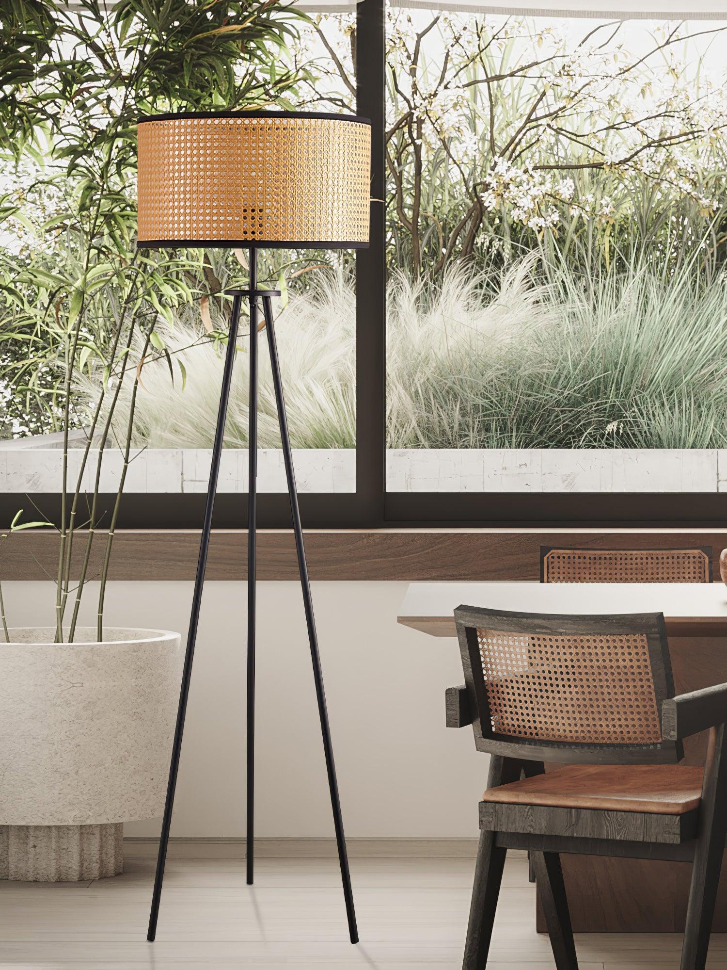 The Aubrey Floor Lamp is expertly designed with a natural color bamboo shade and black edge detailing. It includes three sturdy black-finished metal legs for a modern yet timeless look. Enjoy bright. warm lighting in any room.