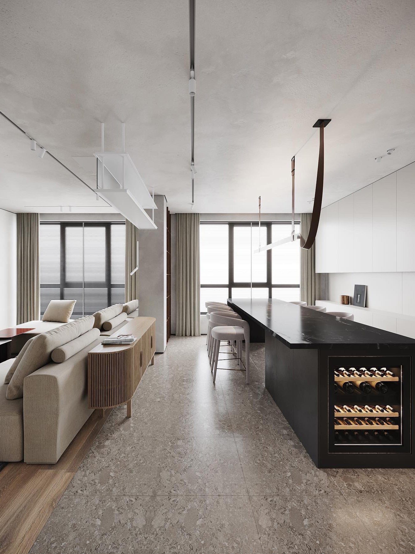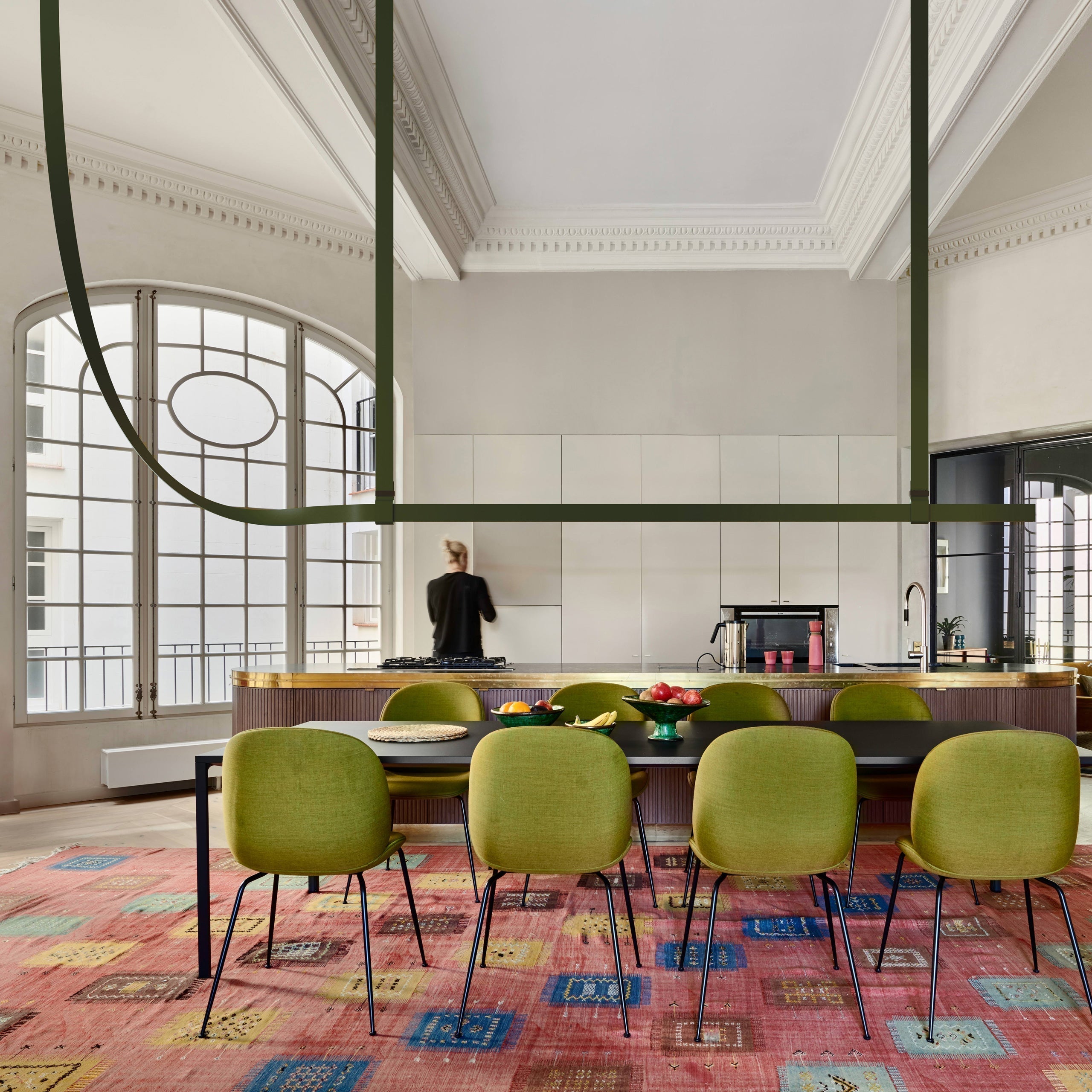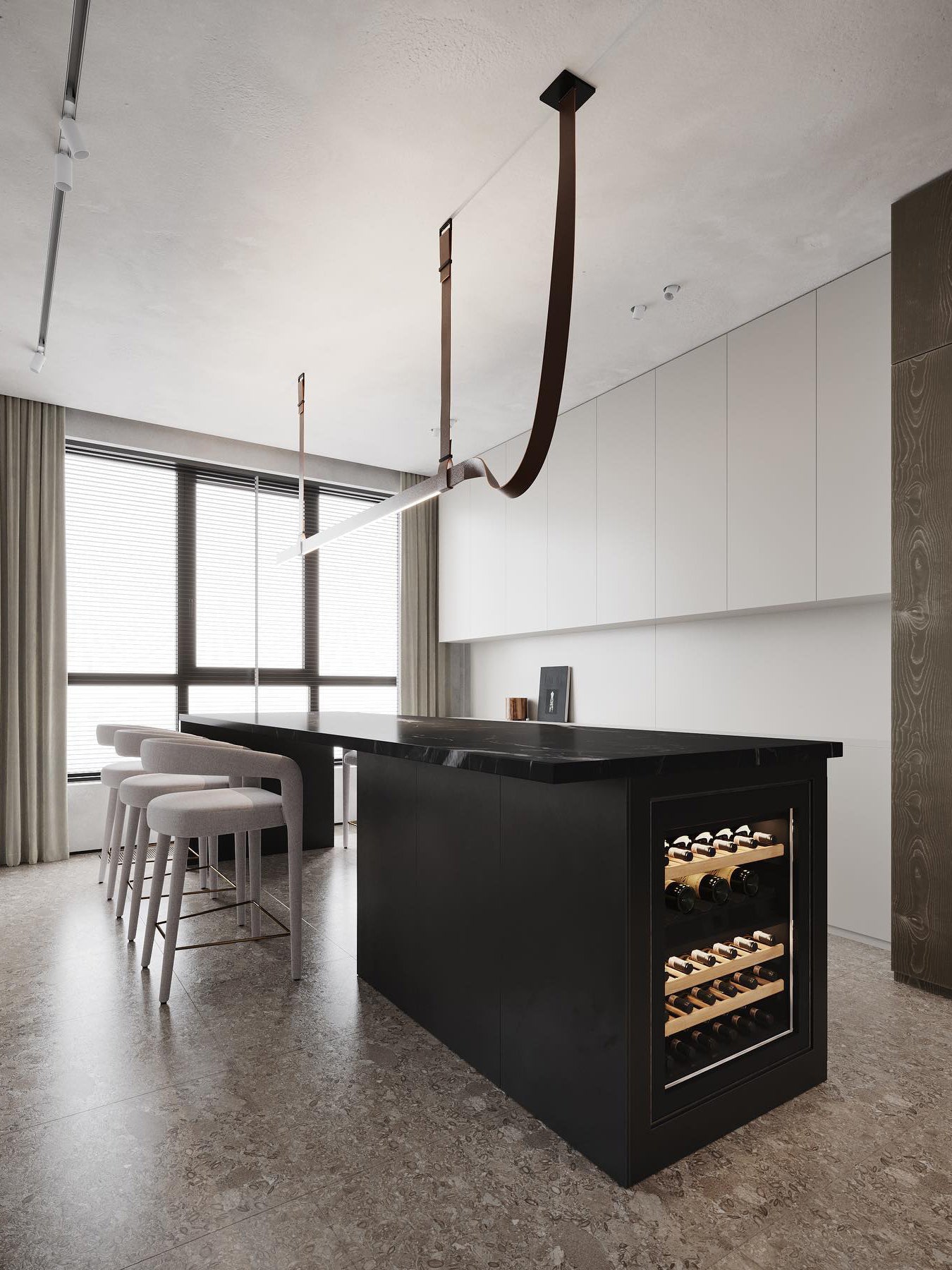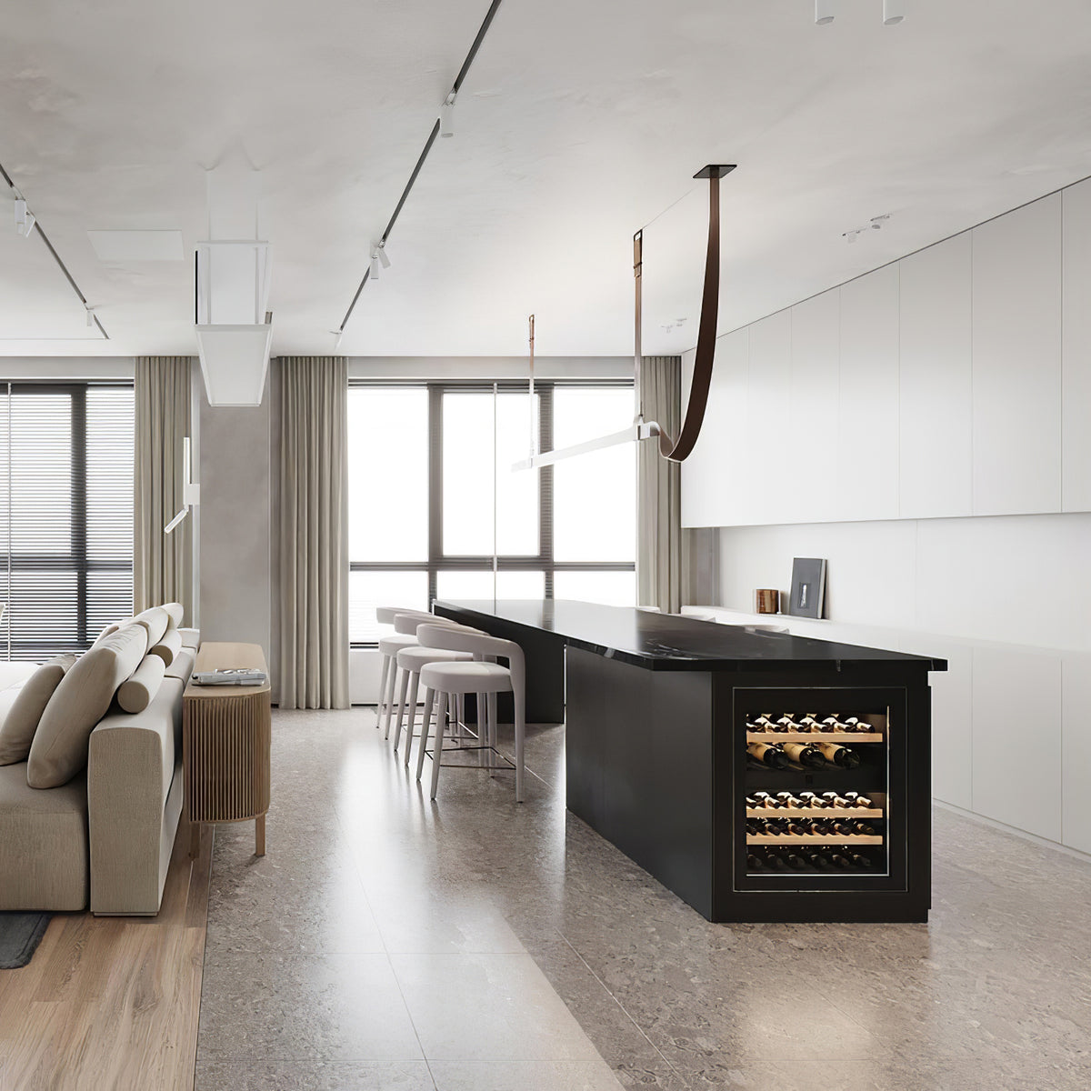 This iconic profile for suspended installation features a refined leather surface developed specifically. Belt is pure flexibility. a sinuous line that creates a balance between the softness of leather and the rigidity of aluminum. The soft part is represented by the connection to the electrical network. while the rigid parts correspond to the light source. the long lines of light.
