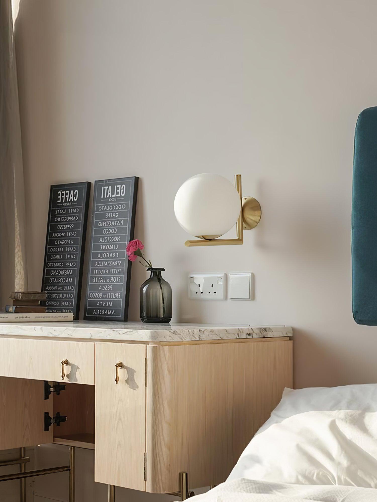 The Blown Glass Opal Glass Wall Lamp is a sleek and contemporary wall light that combines metal and glass materials. creating a perfect blend of durability and aesthetic appeal. Whether used in hallways. living rooms. or bedrooms. this wall lamp provides a soft and diffused lighting effect. creating a tranquil and calm atmosphere.