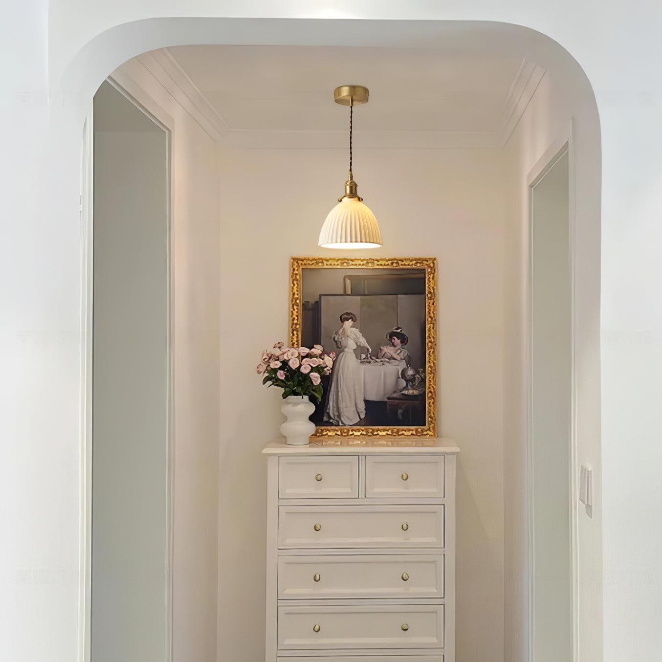 This unique pendant lamp features a pleated brass plated ceramic shade. creating a luxurious yet modern aesthetic. The combination of textures adds an elegant touch to any room. making it a perfect centerpiece for your home.