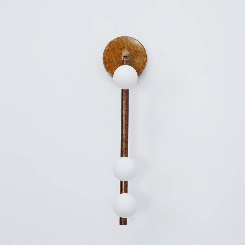 Brass Tube Wall Lamp System is comprised of small blown glass droplets illuminated with warm LEDs. Custom brass tube hardware is available in a variety of new finishes. including verdigris finish created by hand using a mixture of salt and ammonia. The vibrant patina recalls lichen. algae. and other natural phenomena that take over surfaces with a mind of their own. The Mottled Brass and Tarnished Nickel finishes are both oxidized and hand-rubbed. lending depth to the sleek hardware.