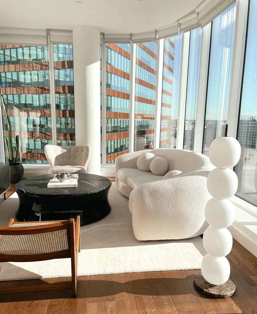 The original hand-blown glass globes are reminiscent of the floats and buoys that decorate theRiver. The integrated lamp button on the upper stem attenuates the glare of the light. The base is available in marble.