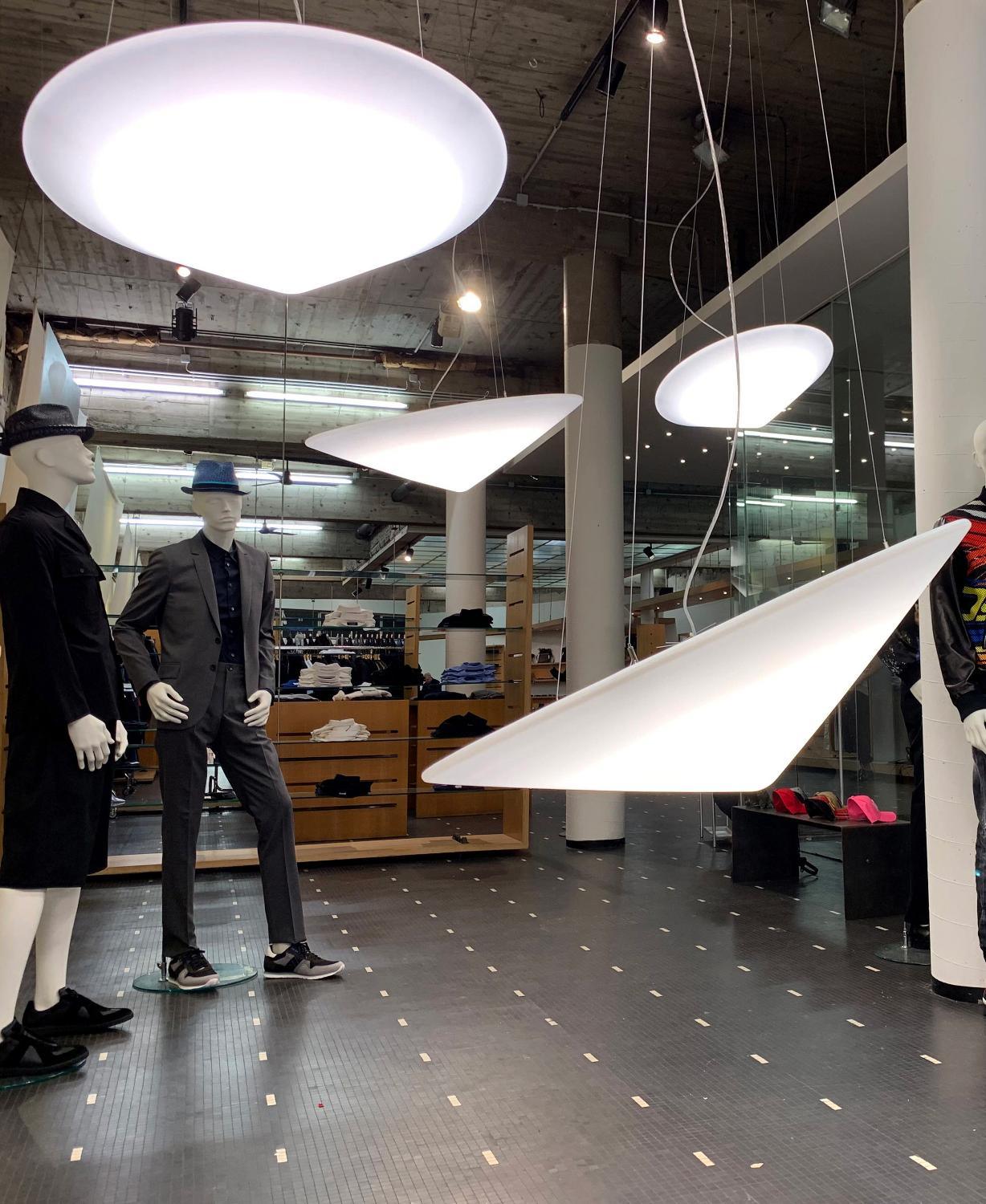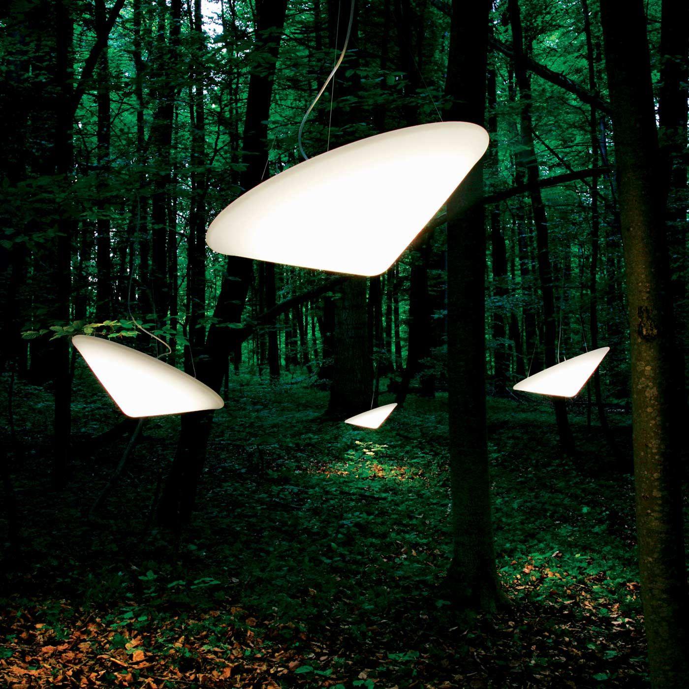 Dimmable with an external phase dimmer. The pendant lamp Cao Mao by next is shaped like the traditional hat of Chinese rice pickers. It seems to be lightweight despite its large size. Its translucent polyethylene diffuser is adjustable in height and can also be tilted to produce a more surprising effect.