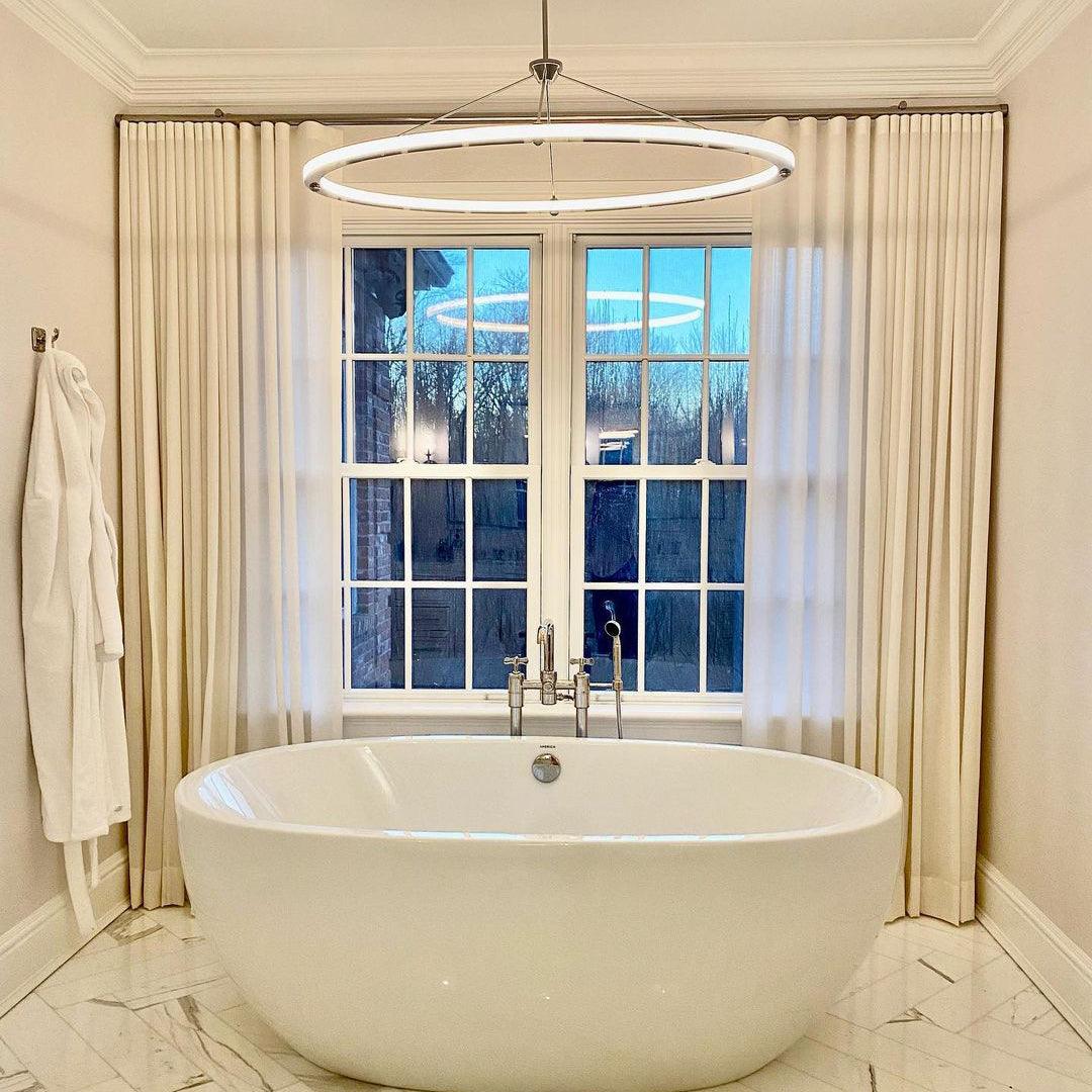 Halo Pendant lamp as a graceful exercise in the use of energy-efficient LED technology. The collection. is distinguished by its use of cascading rings and bars of light.