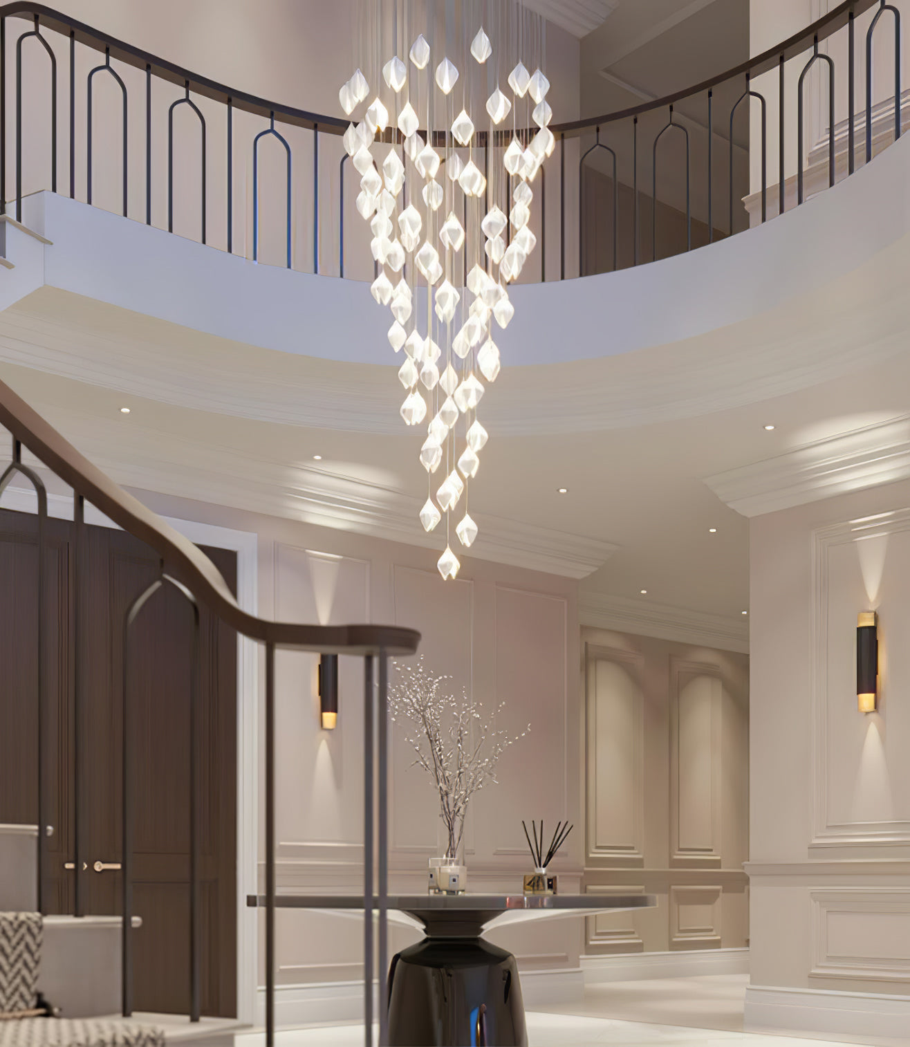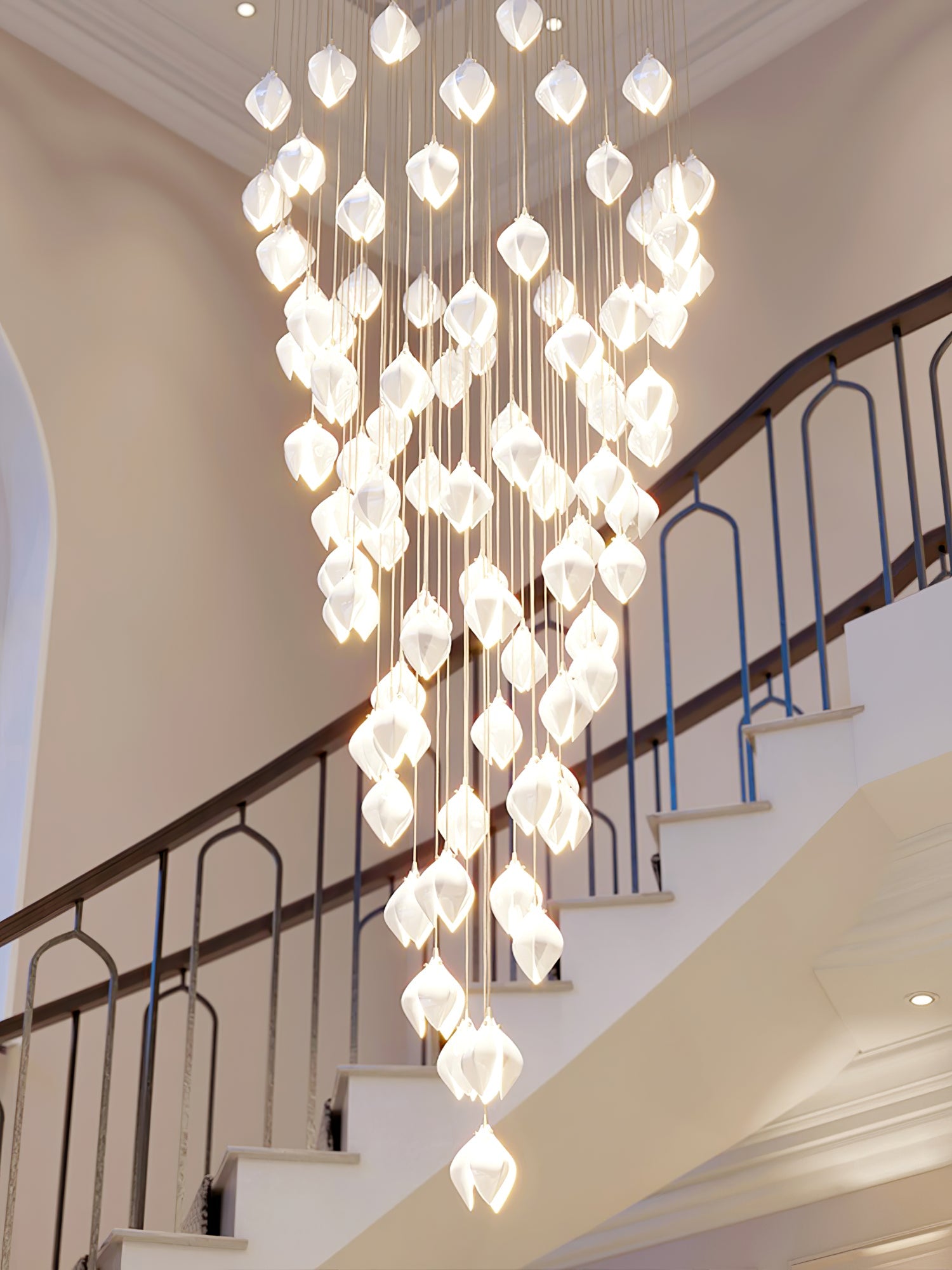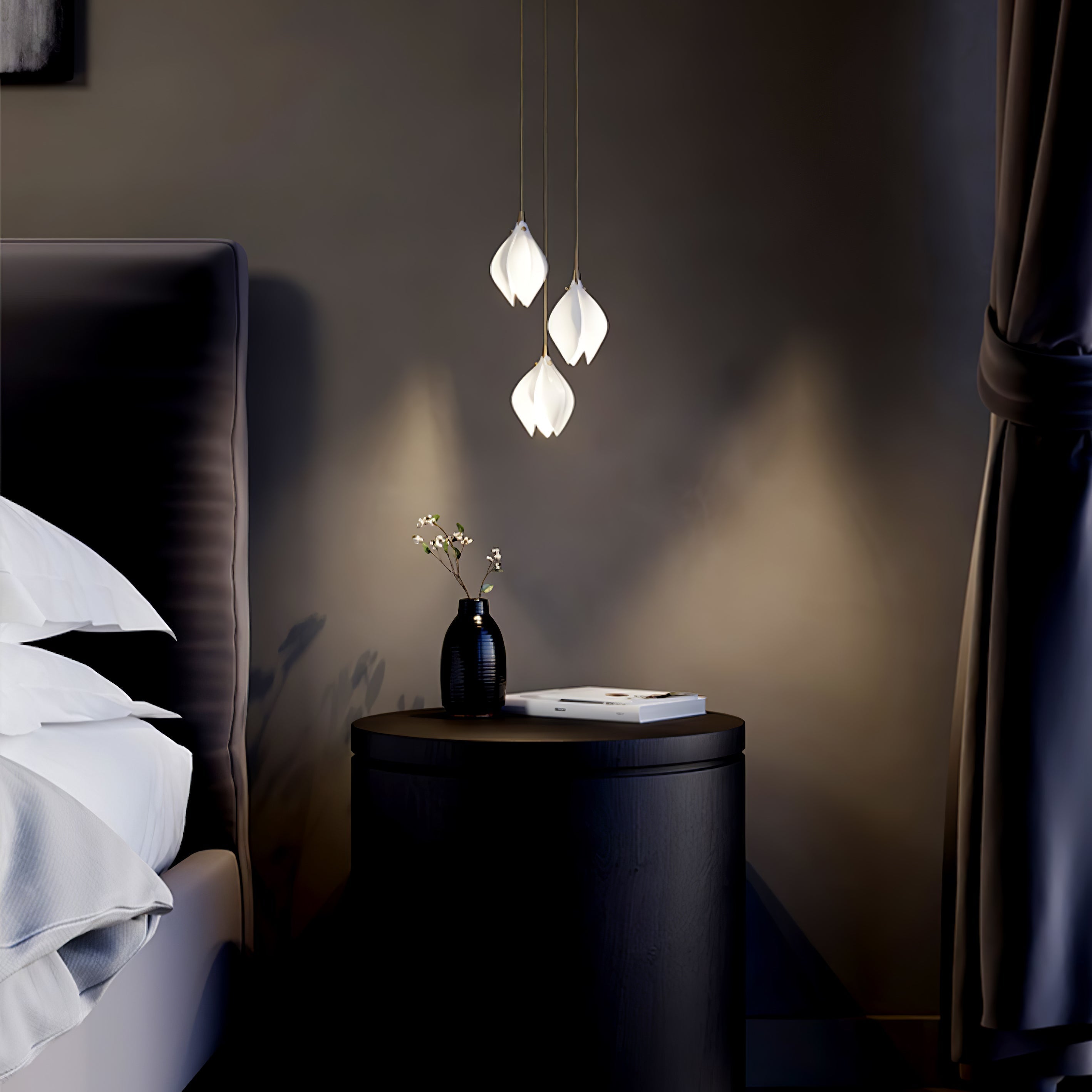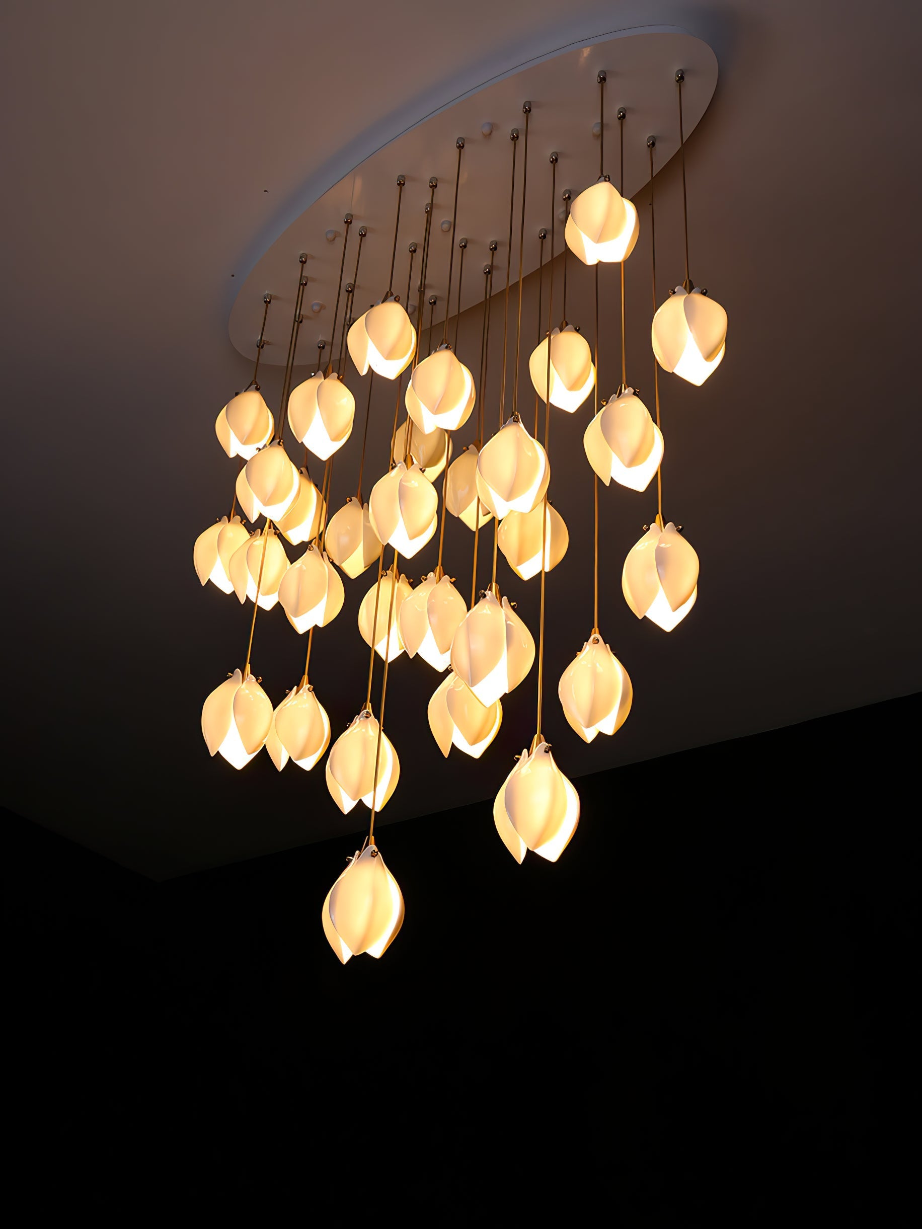 BLOOM is a lighting range inspired by the first blooms of Spring. The stylised Bloom buds are lit from within creating a soft glow through the soft matt or gloss white porcelain petals. Buds are accented in gold with plated fixings and fine silk braided cable to bring a timeless opulence to the installations.