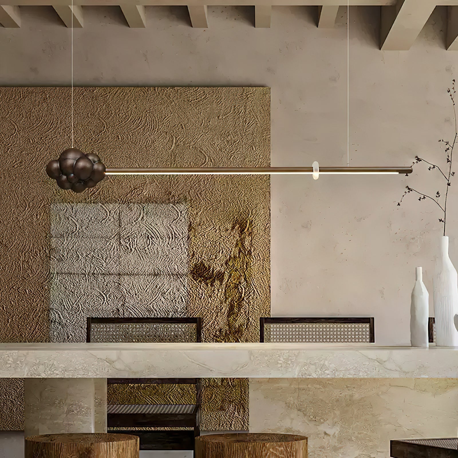 The Cloud Stick Chandelier is a stunning blend of organic and minimalistic design. Its cloud-like clusters add a playful touch. while the sleek stem balances the piece. The rich wood tone and subtle glowing ring create an elegant and sophisticated look. Elevate any space with this unique and imaginative lighting fixture.