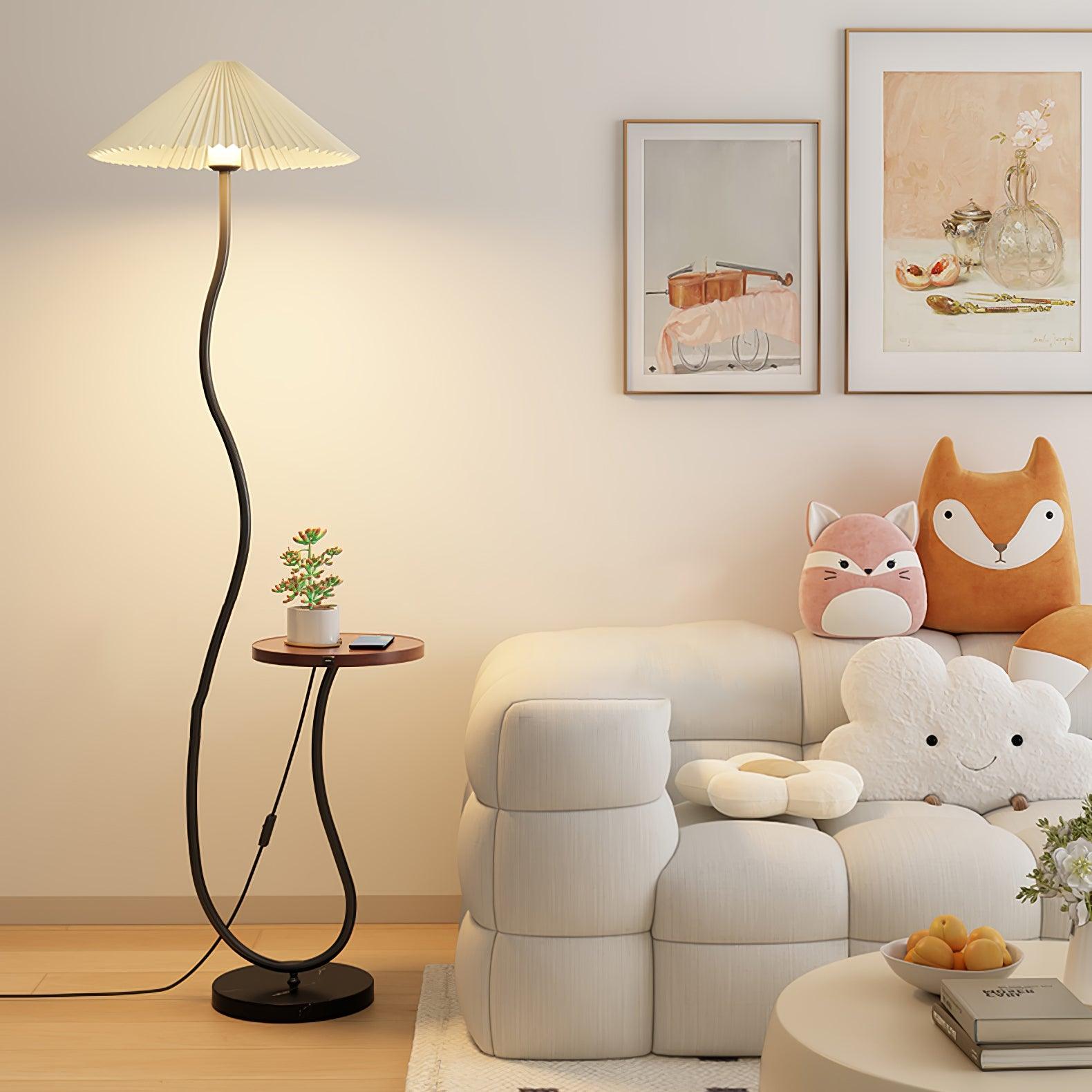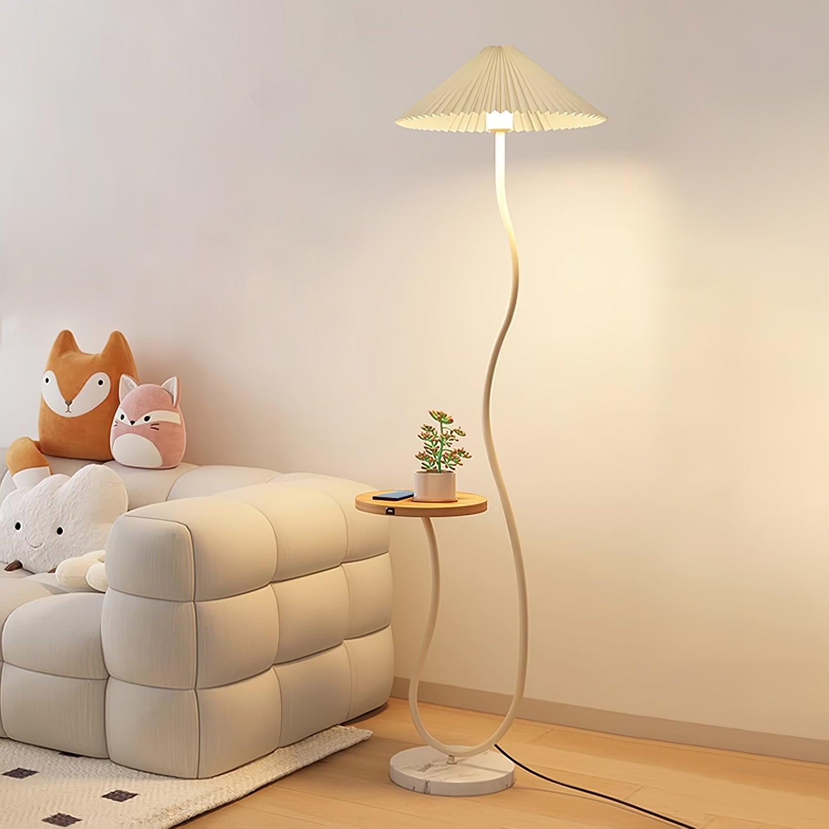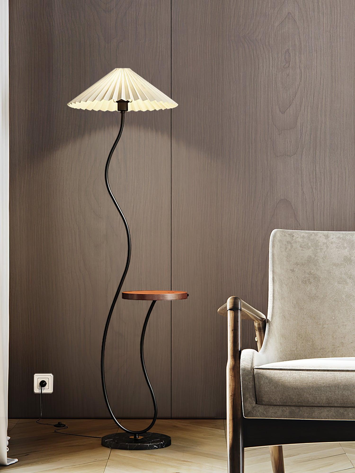 The "Elegante Curvatura Floor Lamp" redefines modern elegance with its fusion of natural and crafted materials. At first glance. it catches the eye with a flowing iron frame that gracefully curves. evoking the movement of a dancer. This sculptural metal stand is complemented by a warm wooden tabletop. offering a functional space to rest a book or a cup of coffee. marrying utility with art. The base of the lamp is a solid piece of polished marble. whose weight ensures stability and whose unique veins add an air of exclusivity. Topping this striking silhouette is a fabric lampshade. whose pleated design adds a classic touch and softens the light to a gentle warmth. Perfect for contemporary interiors that appreciate a blend of the organic and the refined. the "Elegante Curvatura" stands as not just a light fixture but as a statement piece. adding character and sophistication to any room.