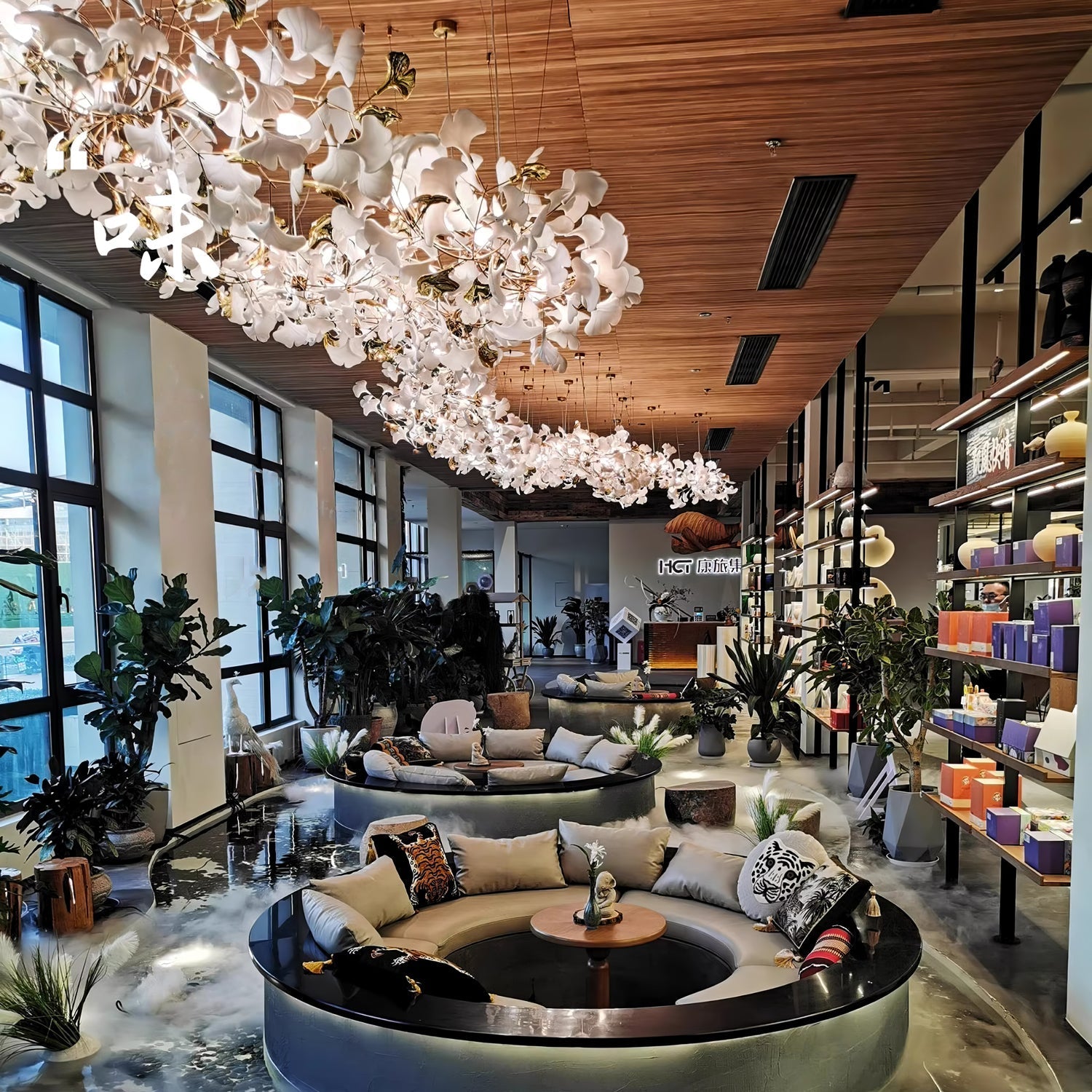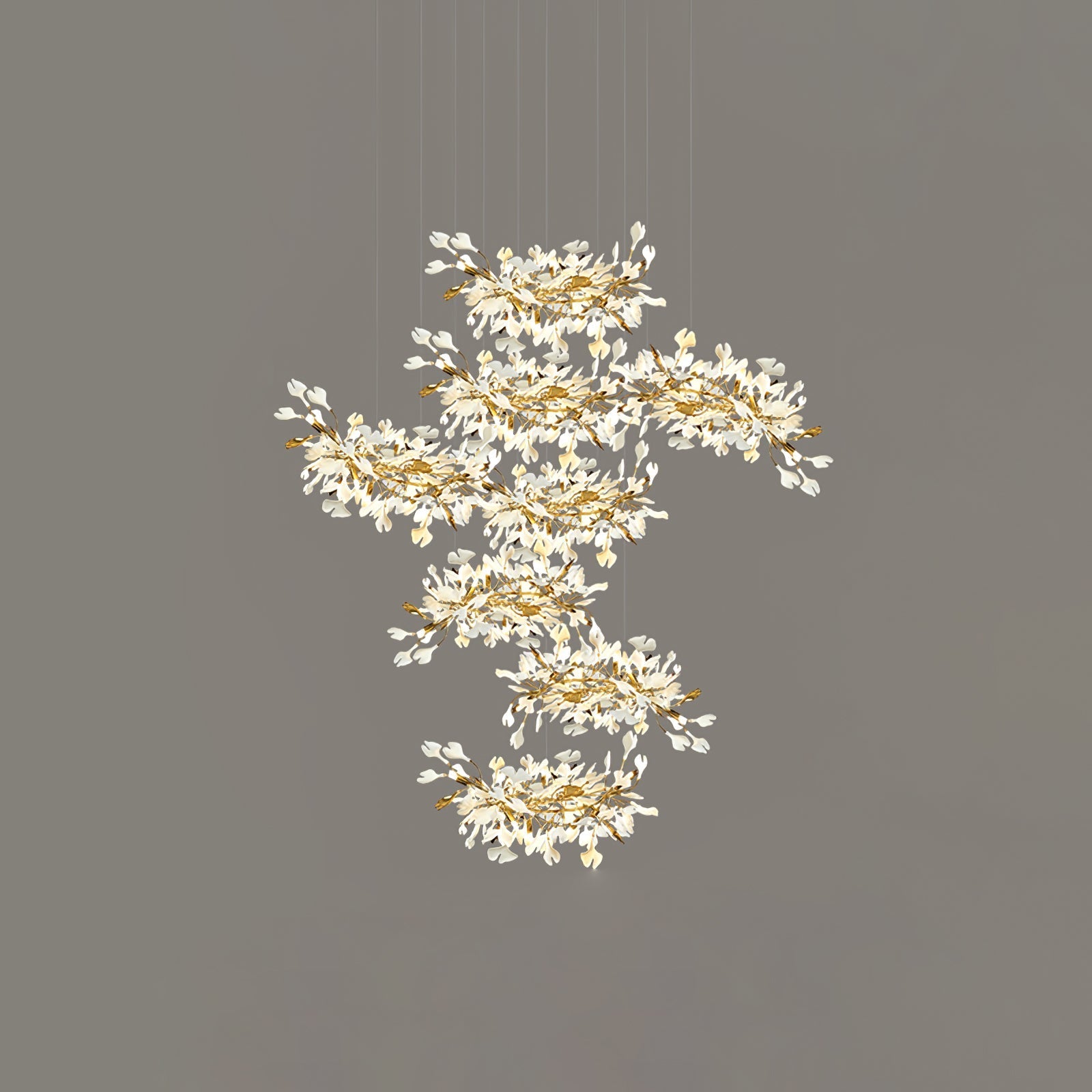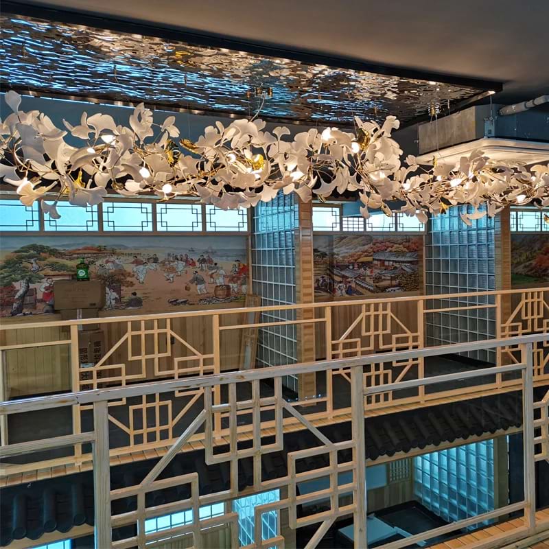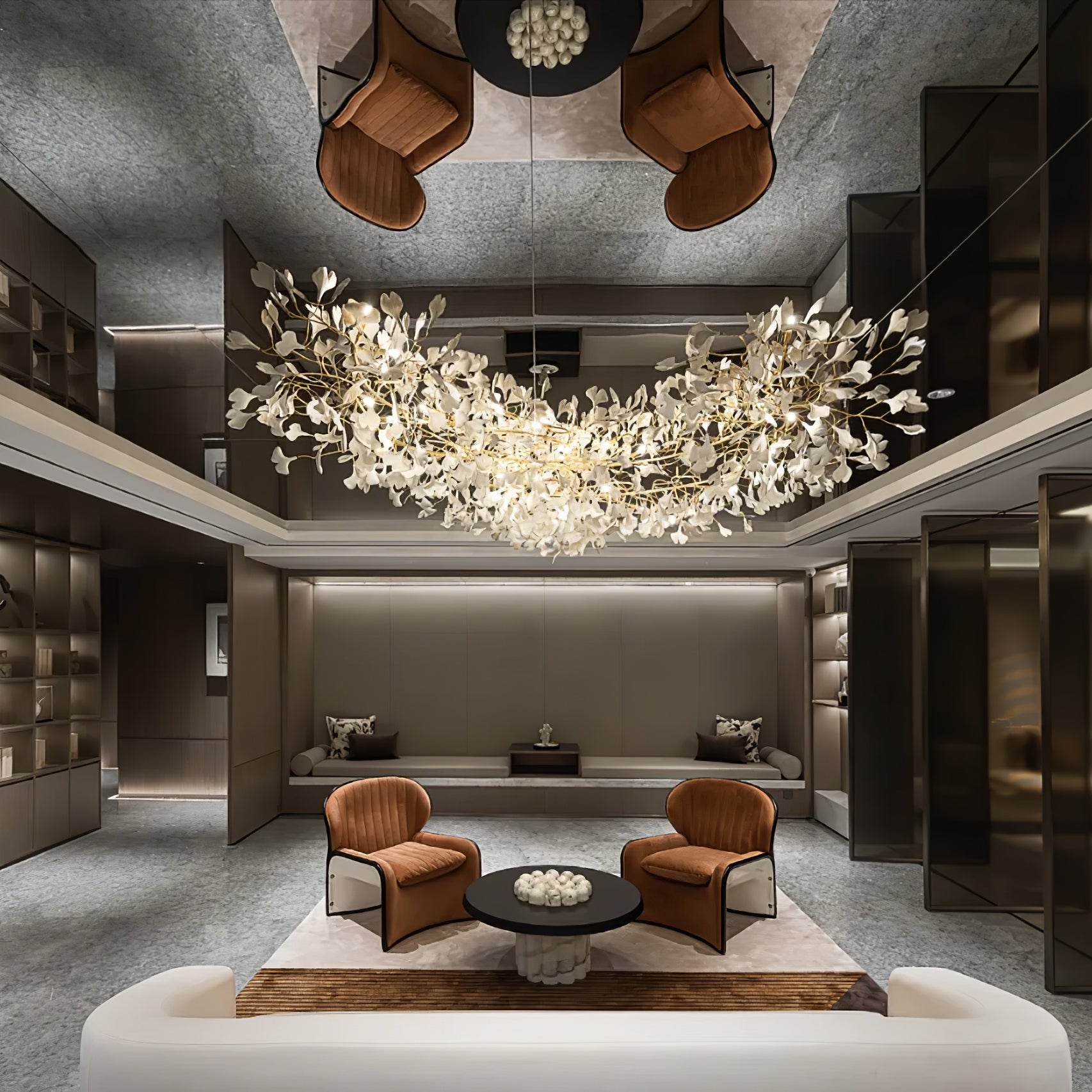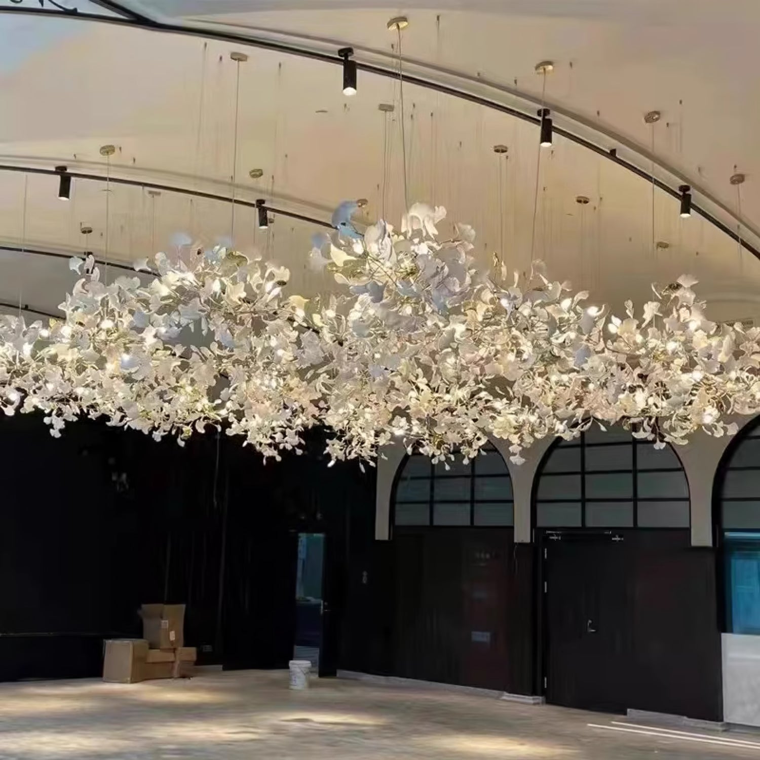 Featuring a luxurious overall design and advanced manufacturing technology. the Customize Gingko Chandelier showcases its opulence through exquisite ceramic petals adorning the metal lamp body. Immerse yourself in the perfect blend of lighting and nature with this bespoke installation. handcrafted with porcelain leaves. Experience the harmonious interplay of light and ceramic. creating a welcoming ambiance that promotes well-being. Beyond its functional purpose. this light sculpture defines its own striking appearance. eliciting awe as a mesmerizing piece of artwork. Like a living plant. it exudes a natural. dynamic energy that brings tranquility and vitality to any space. Working in tandem with the architectural and design vision. this installation is a symbol of harmony between man and nature.