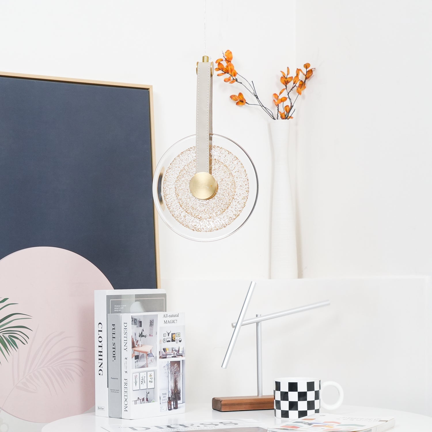 Golden Disc designed by Paolo Castelli is a suspension lamp made with a hand-modeled luminous element in Murano glass. covered with three layers of gold leaf. The glass. which reflects light and radiates it into the room. is set in a metal disc with a matt gold finish and supported by metal support covered in white-colored leather.