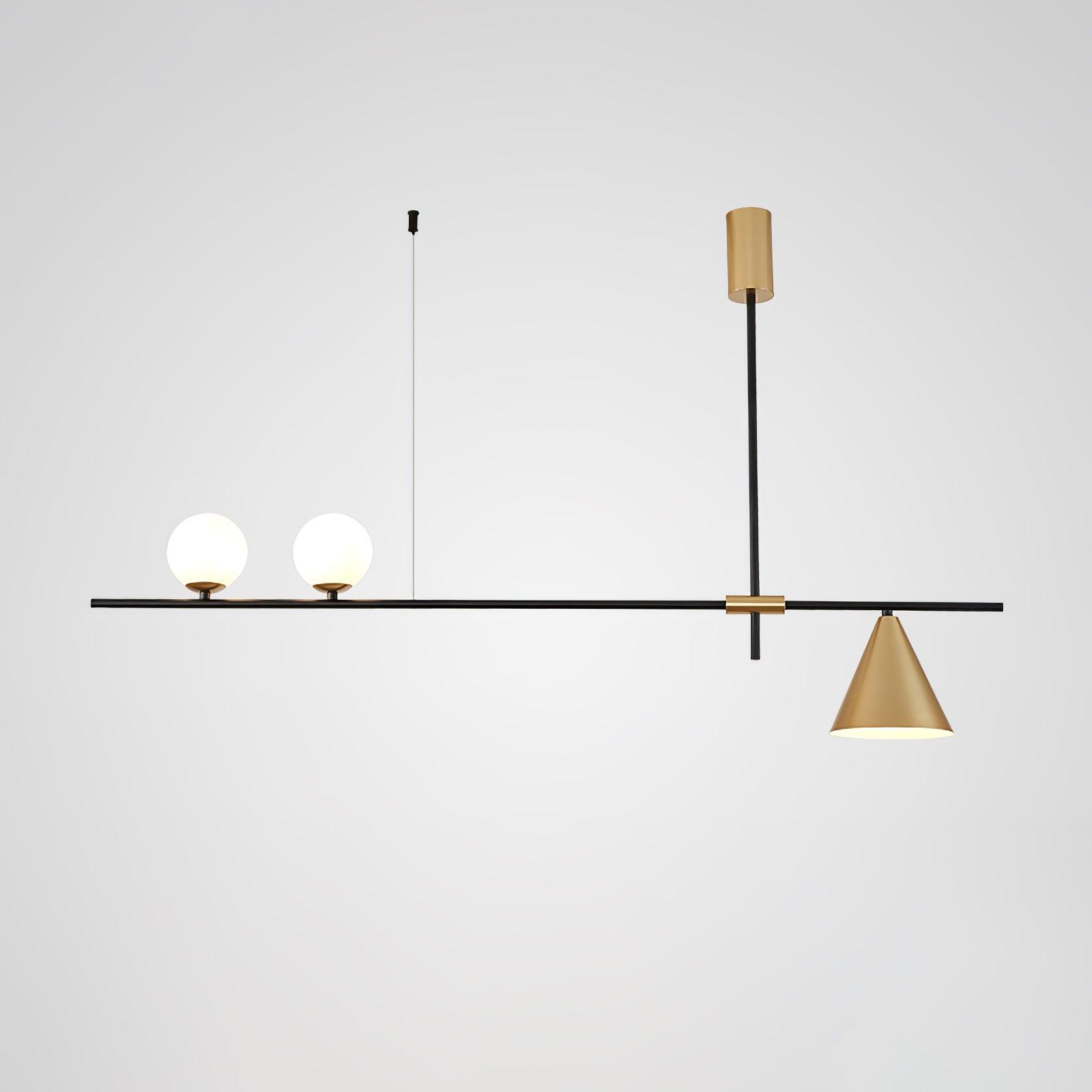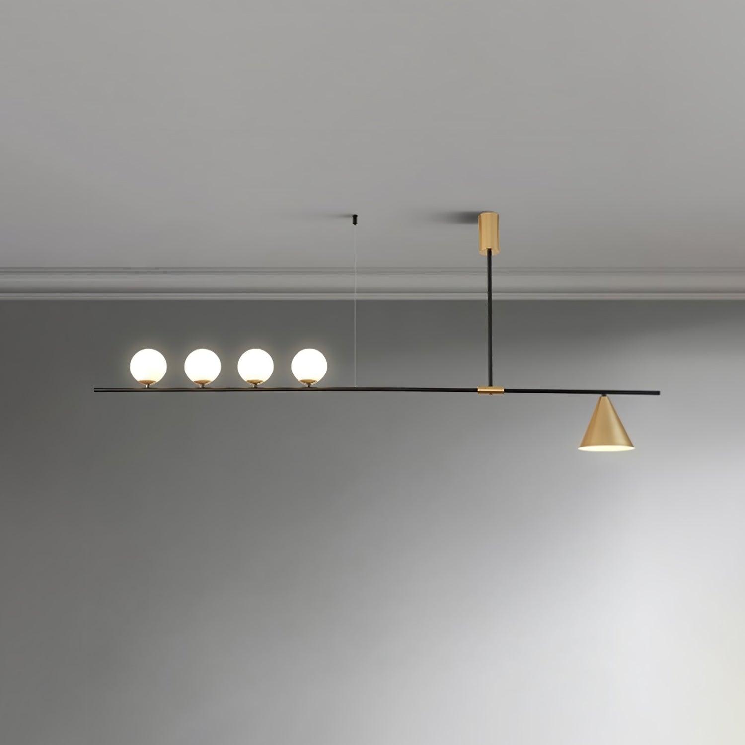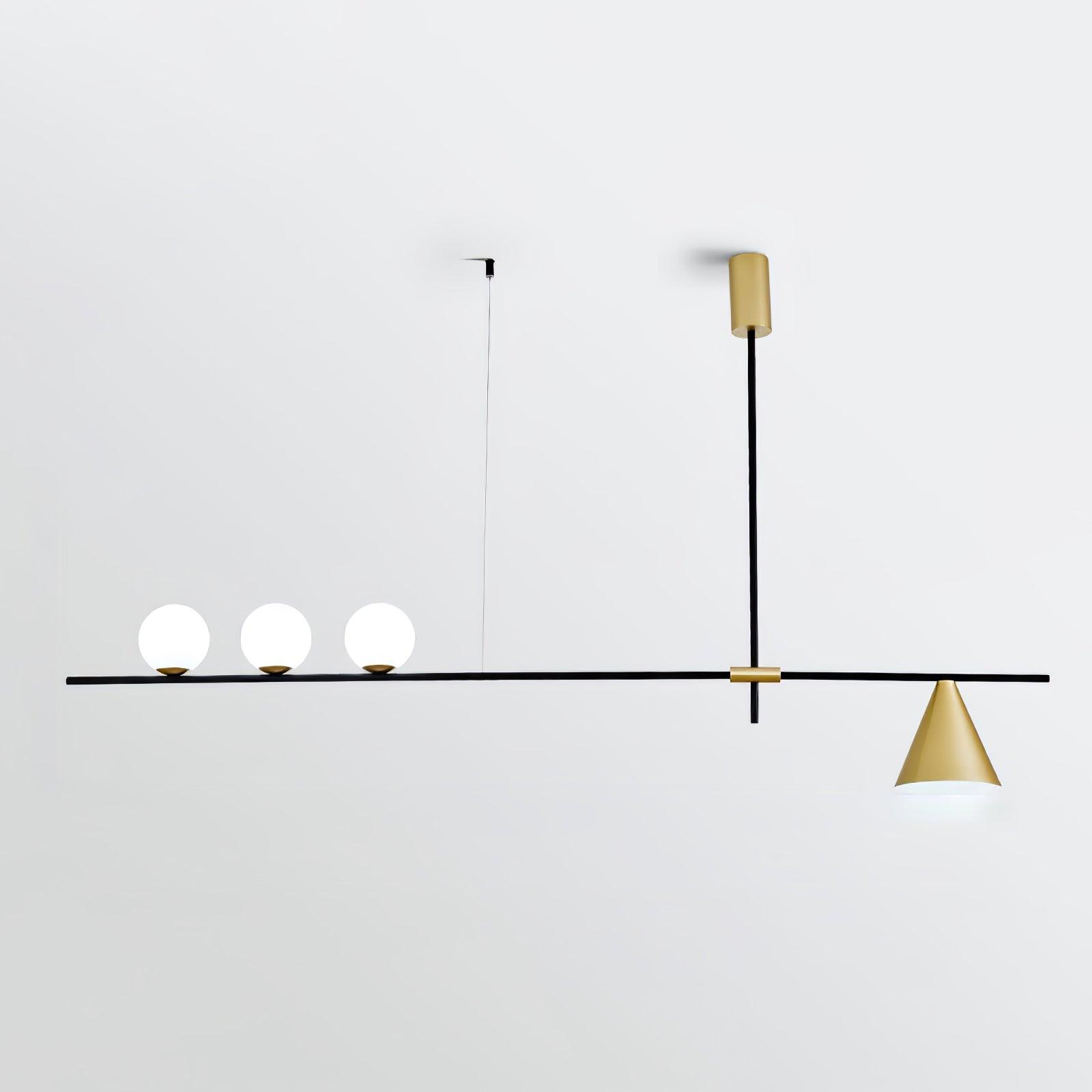Crafted with precision. this exquisite fixture features a sleek black metallic bar that suspends a series of opal glass globes. each one casting a soft. diffused light that evokes the serene ambience of a solar eclipse. The contrasting geometric cone adds a touch of avant-garde style. making it a bold statement piece for any modern living space or dining area. The glass and metal materials combine to create a durable. high-quality lighting solution that balances form and function. Illuminate your home with the Eclipse Linear Suspension Light and enjoy a celestial blend of art and illumination.