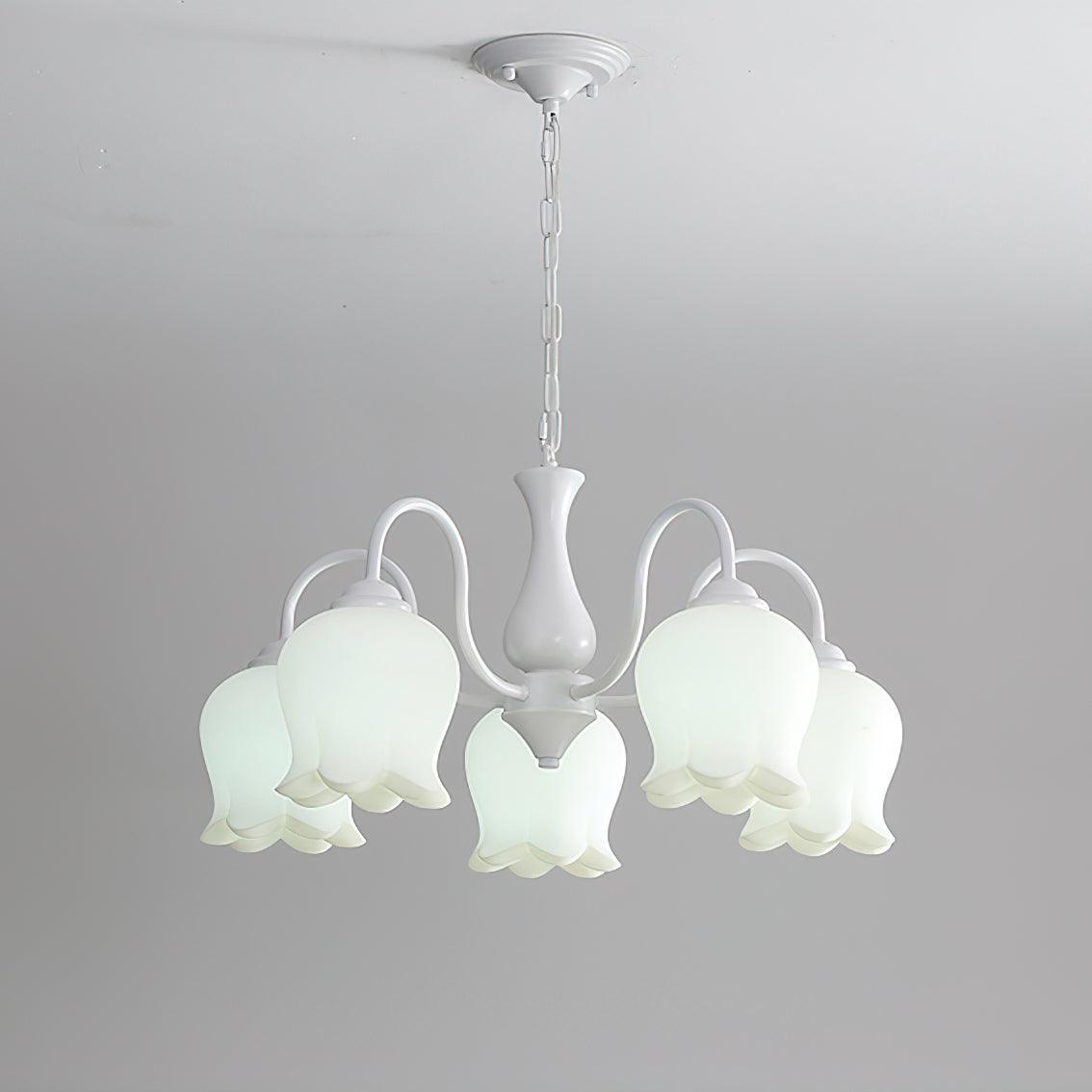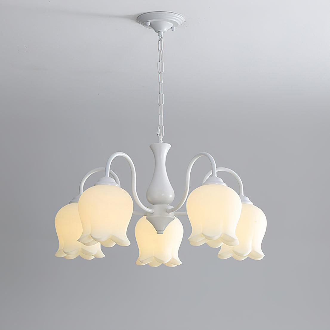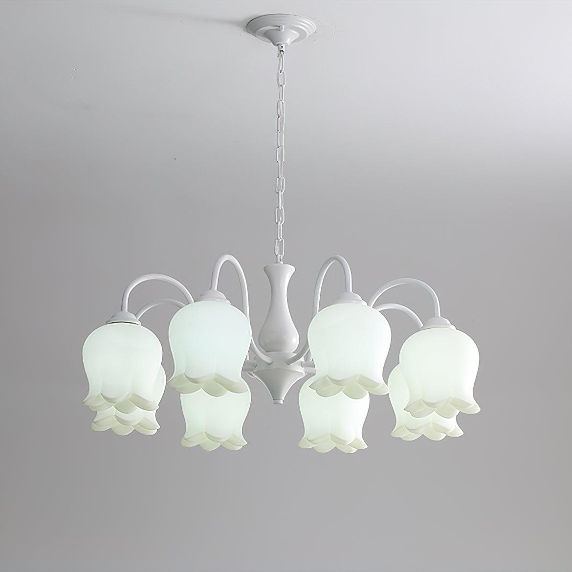 The Elegant Lilium Chandelier brings an old-world charm to any room. Its vintage-inspired French lily-shaped matte PE lampshade is crafted with exquisite garland-style detailing. making it a perfect choice for classic style lighting.