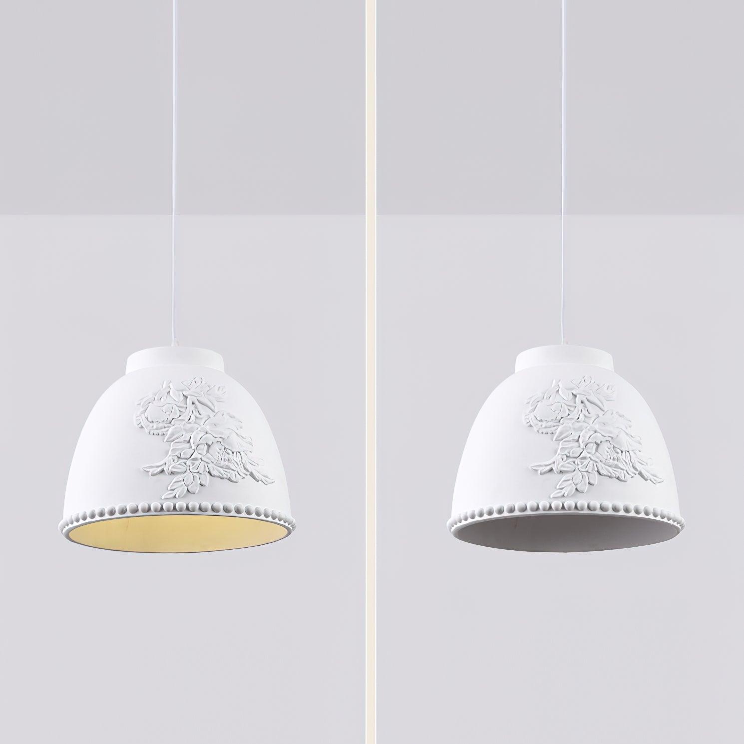 The dome-shaped shade. crafted from high-quality resin. features an intricately embossed floral pattern that evokes the delicate touch of a craftsman's hand. The stark white finish brings out the depth and texture of the foliage-inspired design. allowing for a striking interplay of light and shadow when illuminated.