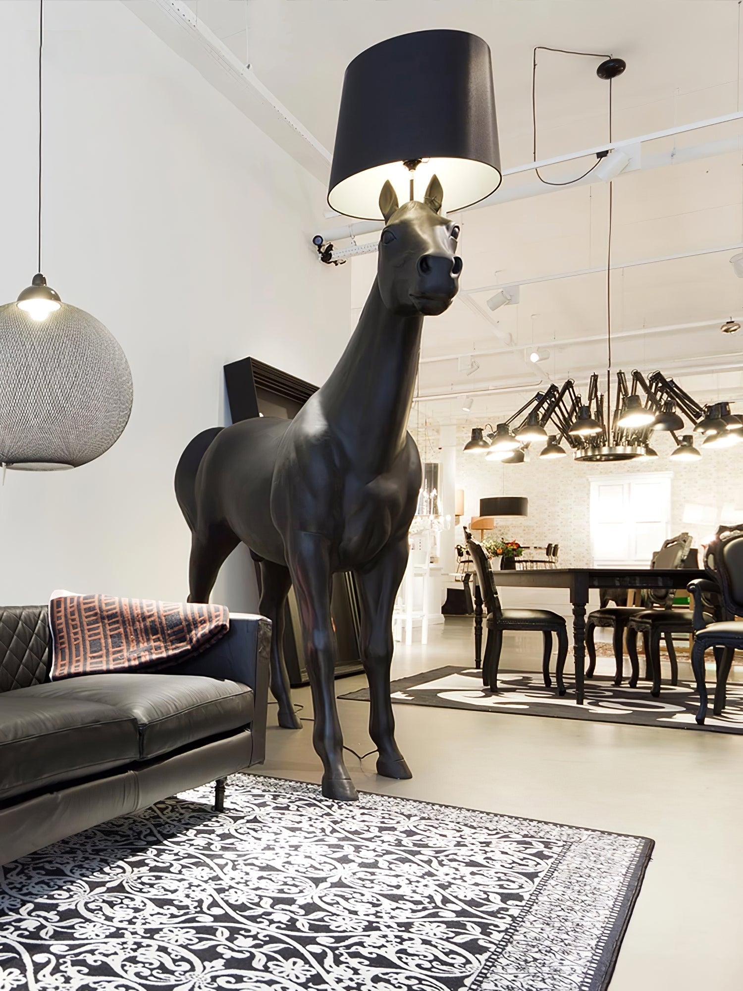 Make a bold statement with Vakkerlight's Equine Majesty Floor Lamp. a stunning fusion of art and function. This larger-than-life floor lamp is crafted in the shape of a majestic horse. adding an avant-garde touch to your interior. The sleek black finish and modern design transform it into a captivating centerpiece that demands attention. Perfect for art-inspired living spaces. high-end interiors. or contemporary homes. the Equine Majesty Floor Lamp is sure to elevate any room with its unique charm and creative aesthetic. More than just a lamp. it's a conversation piece that brings a touch of luxury and playful sophistication to your decor.
