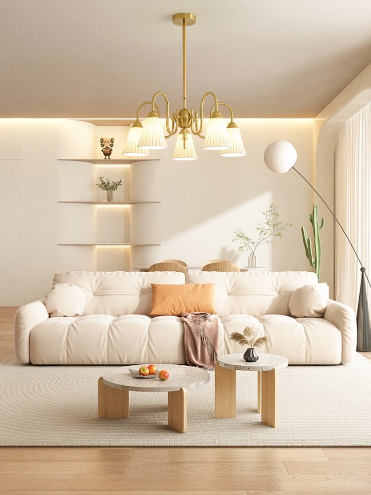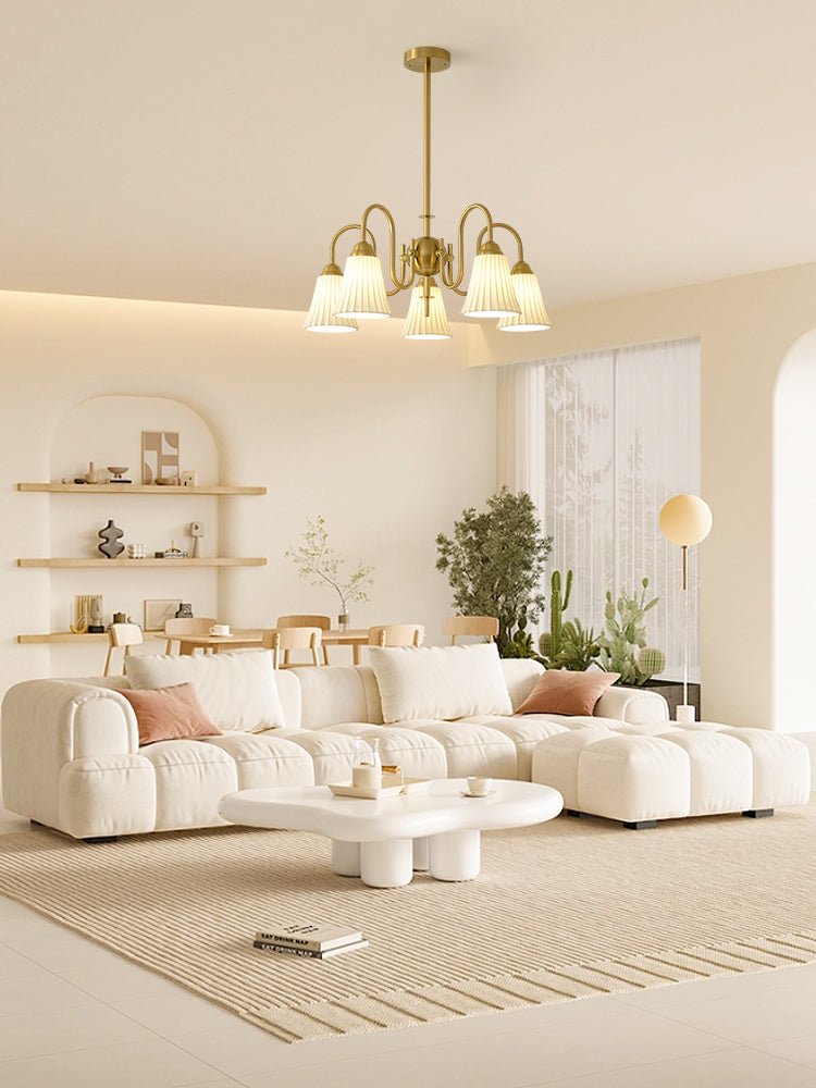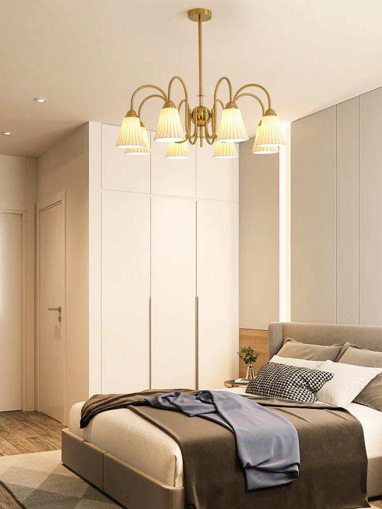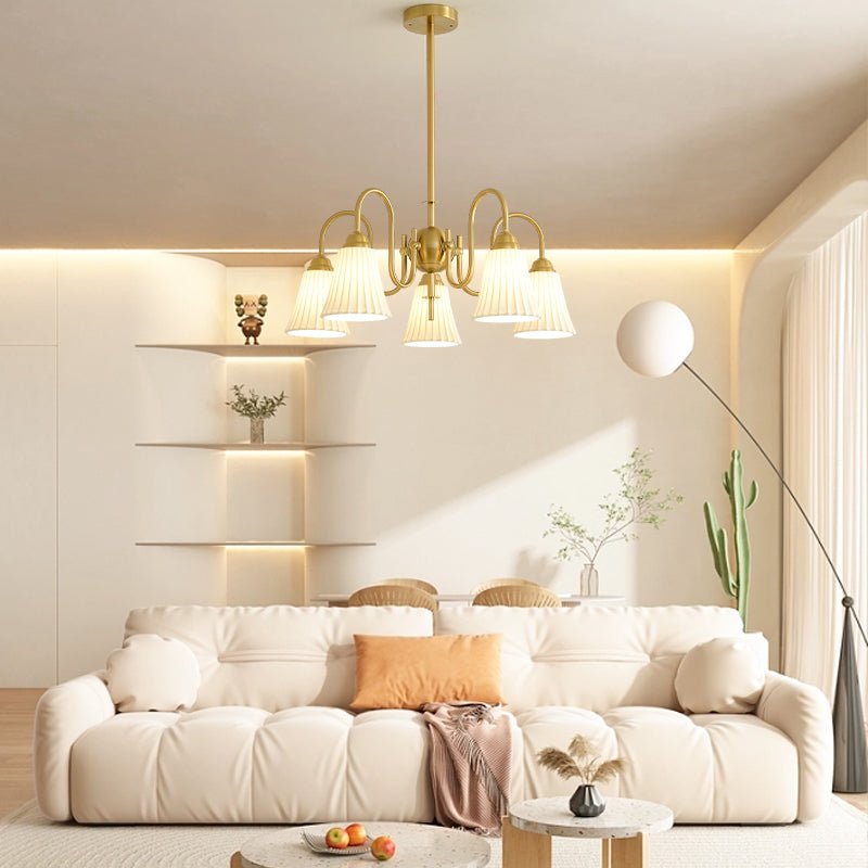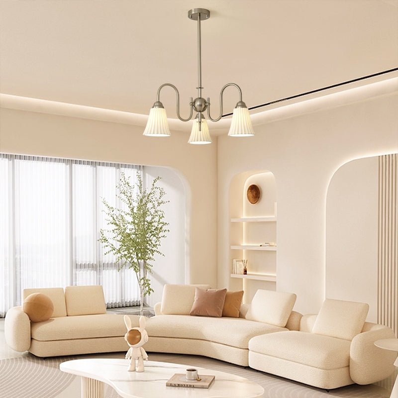 Intricately pleated shade lamps meet a simple frame in the Esther Chandelier. The white Ceramic for soft illumination in your space. in a balanced configuration. A straightforward structure made from iron brings a beautiful modern element to a traditional lighting fixture.