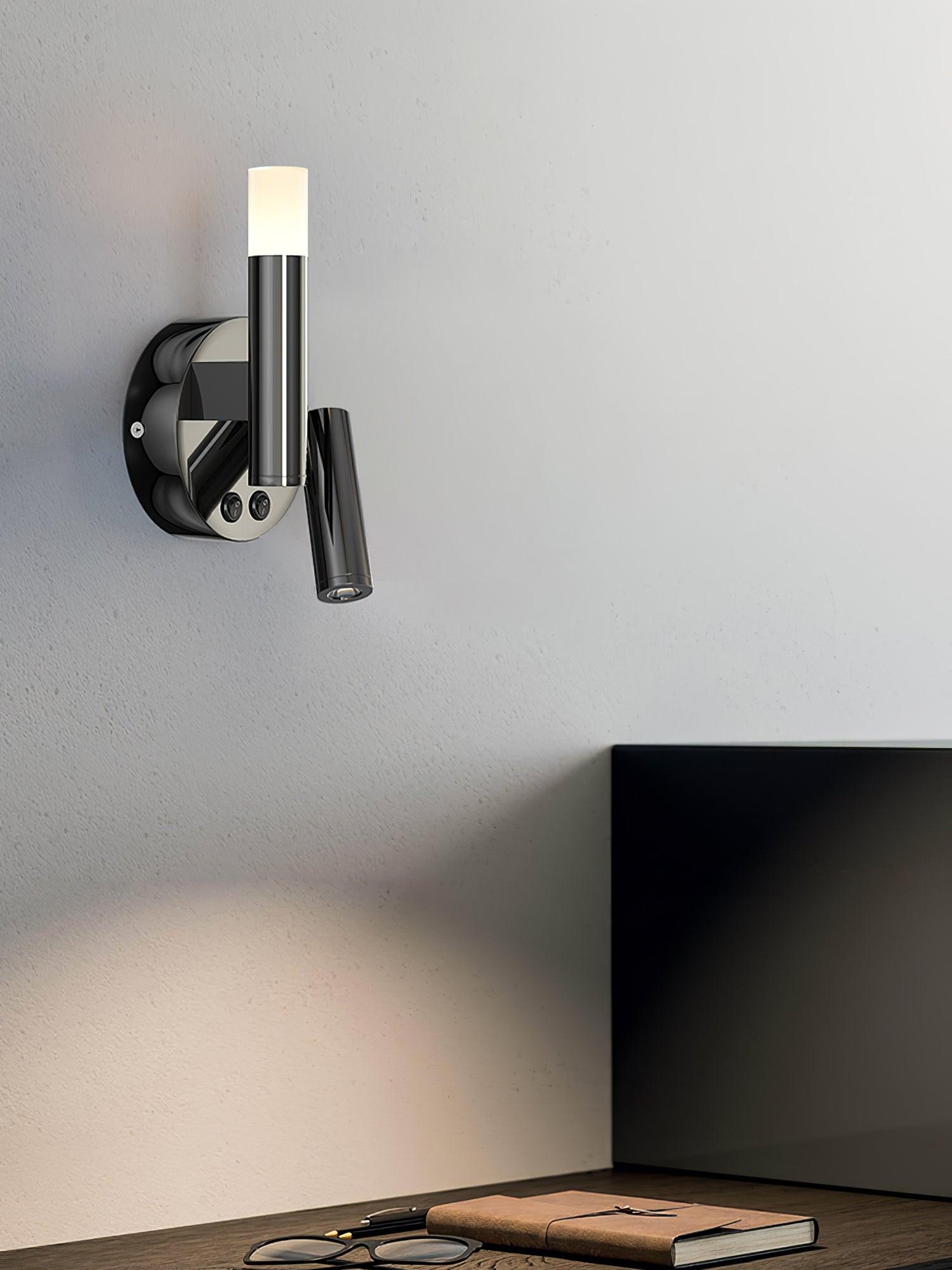 Takes little space as when closed it sits flush with the wall. It can be mounted either way up. One of the main features of this fitting is that fitting acts as a switch – the lamp instantly turns on when you pull it out from its flush position and turns off when pushed back.