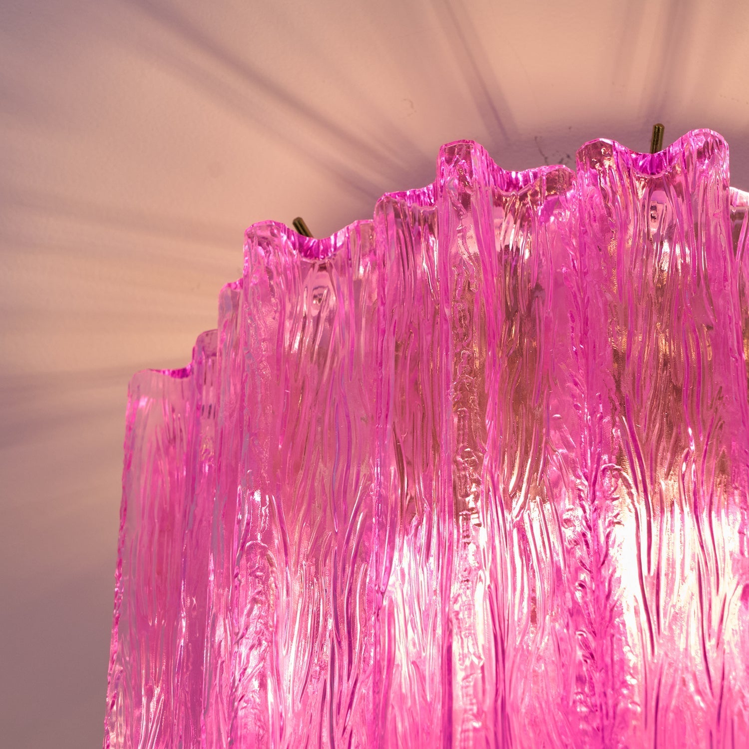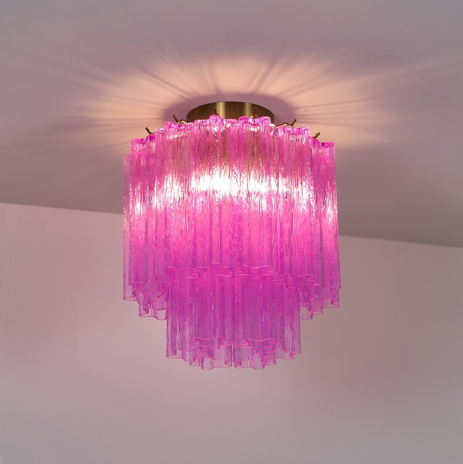 The Fiora Pink Glass Ceiling Lamp brings a bold splash of color and elegance to your ceiling. Featuring stunning layered pink glass panels that cascade gracefully. this fixture emits a soft. diffused light while adding a playful yet sophisticated touch to any room. The champagne gold base enhances the vibrant pink. creating a striking contrast that draws the eye. Perfect for bedrooms. living rooms. or even a modern dining space. the Fiora flush mount is designed to transform interiors with its unique blend of color. style. and light.
