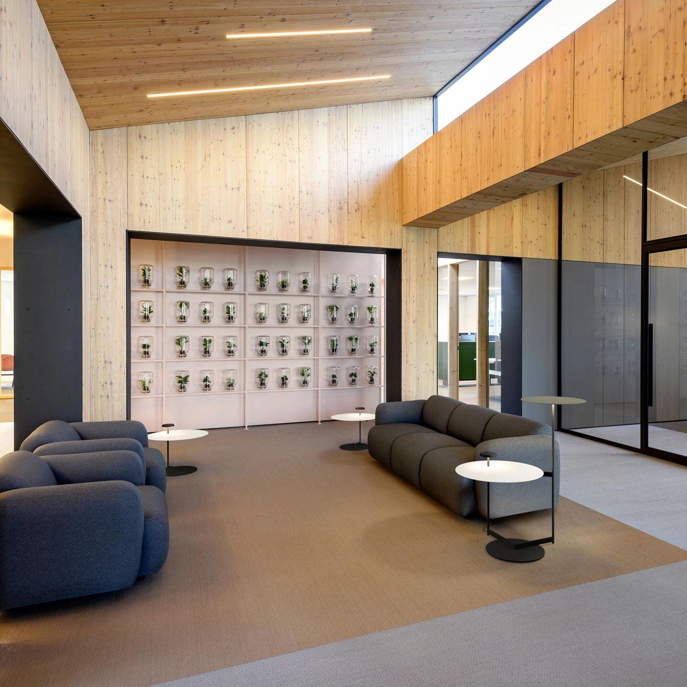The Flat floor lamp with either a simple or double metal pan. a compact disc. or a plate that acts as an auxiliary piece of furniture. When arranged in pairs the smaller matching disc captures the reflected light within the larger pan thus creating a focus of softer grouped lighting that lights both space as well as the light's own surfaces.