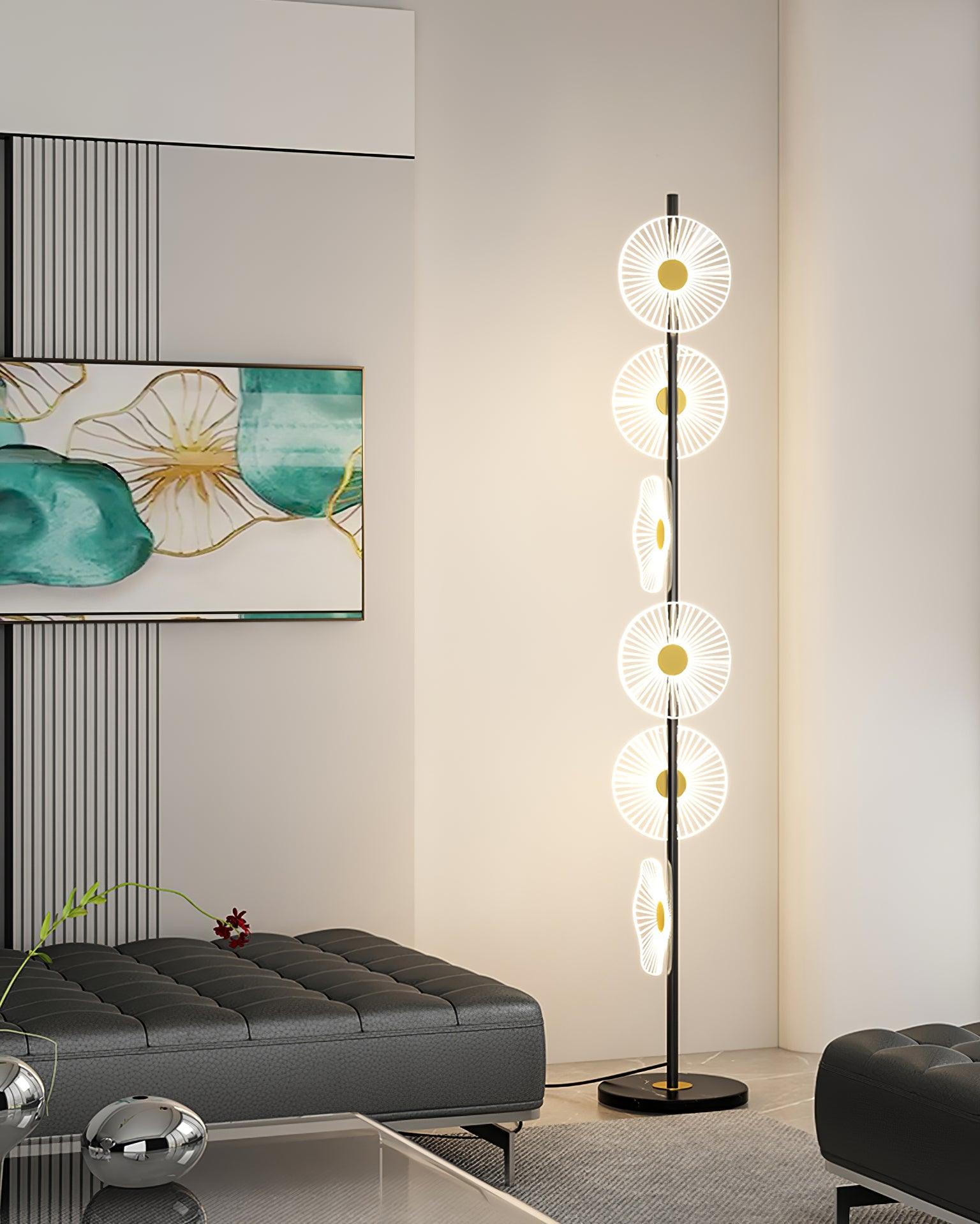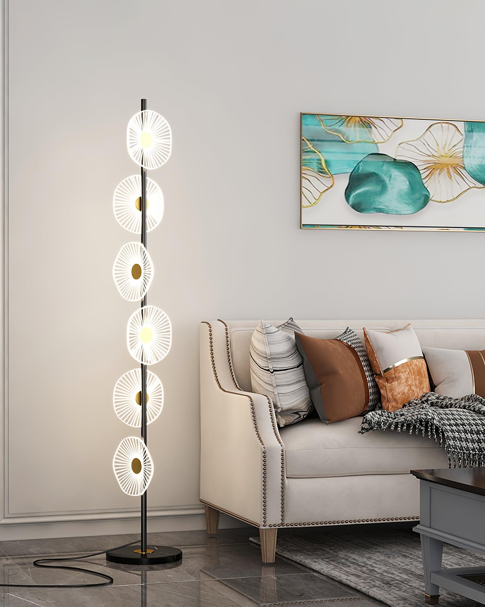 Smooth marble tops hold these unique acrylic pieces as they playfully diffuse an energy-efficient layer of illumination. bringing a warm. beautiful display of light with some elegant flair to their surroundings. The light in a falling-leaves formation with tiered shape. creating a diffused ambient glow.