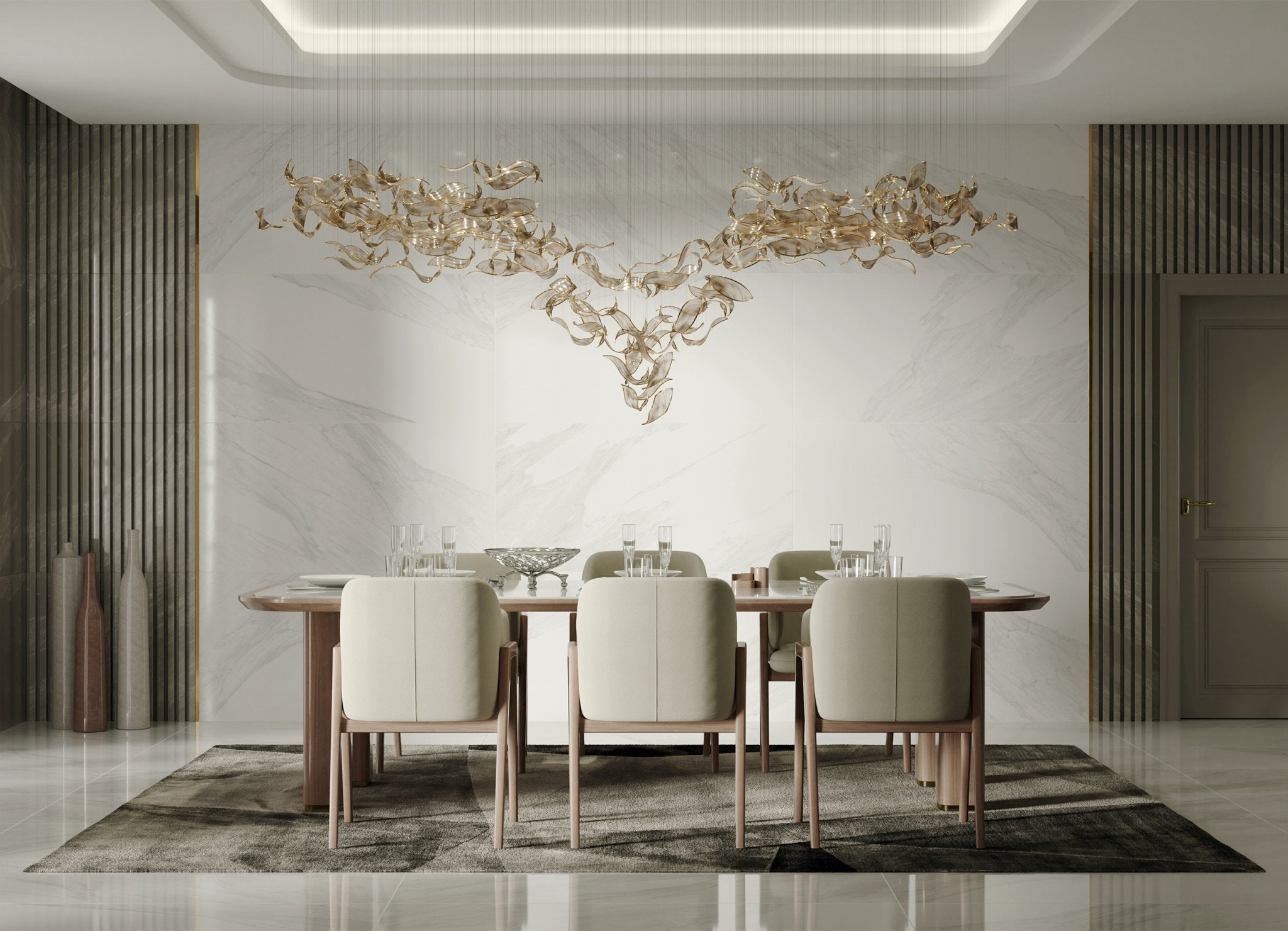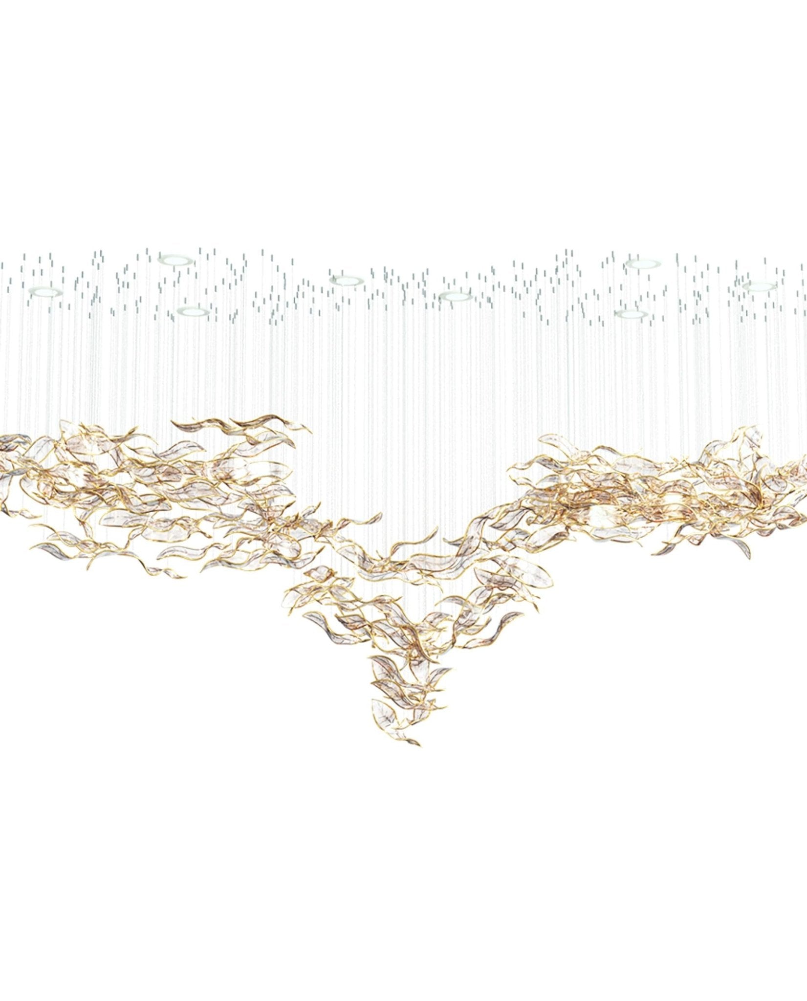 Elevate your space with our Fluttering Leaves Chandelier. Inspired by nature. its delicate glass leaves and gilded lines create a stunning composition of shape and light. Like a work of art. this chandelier adds an elegant and exclusive touch to any room. Experience the beauty and luxury of the Contour collection.