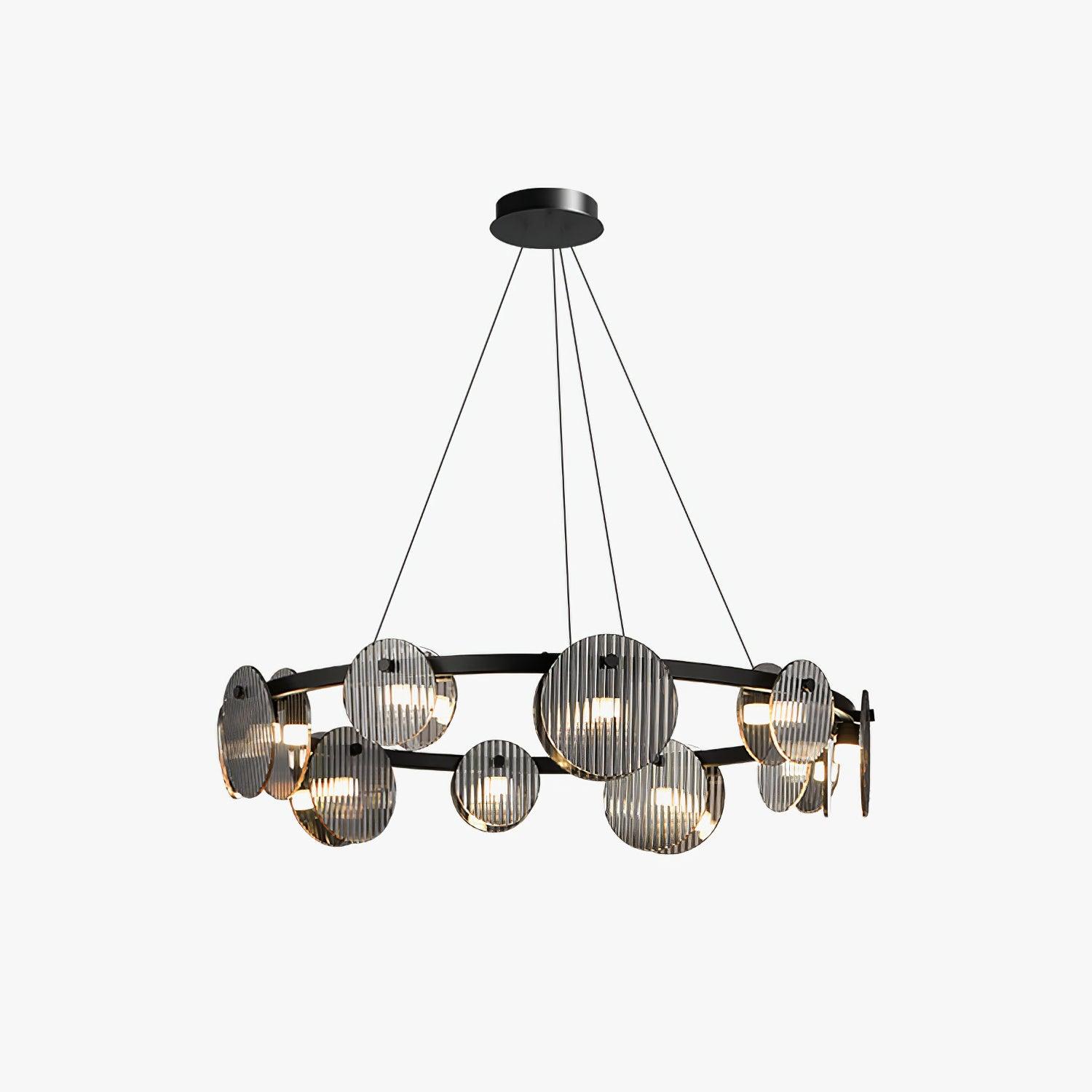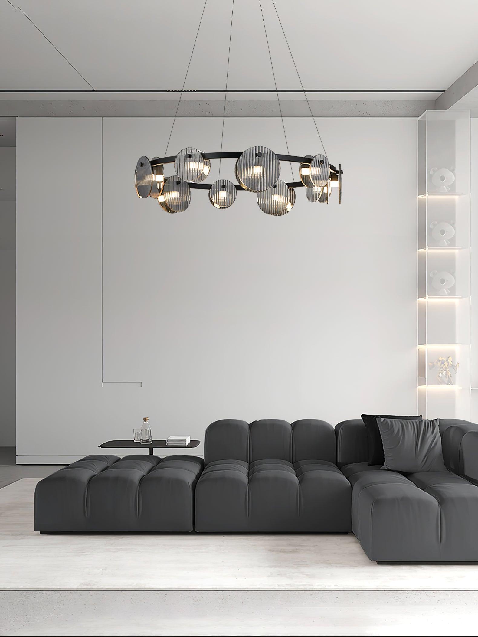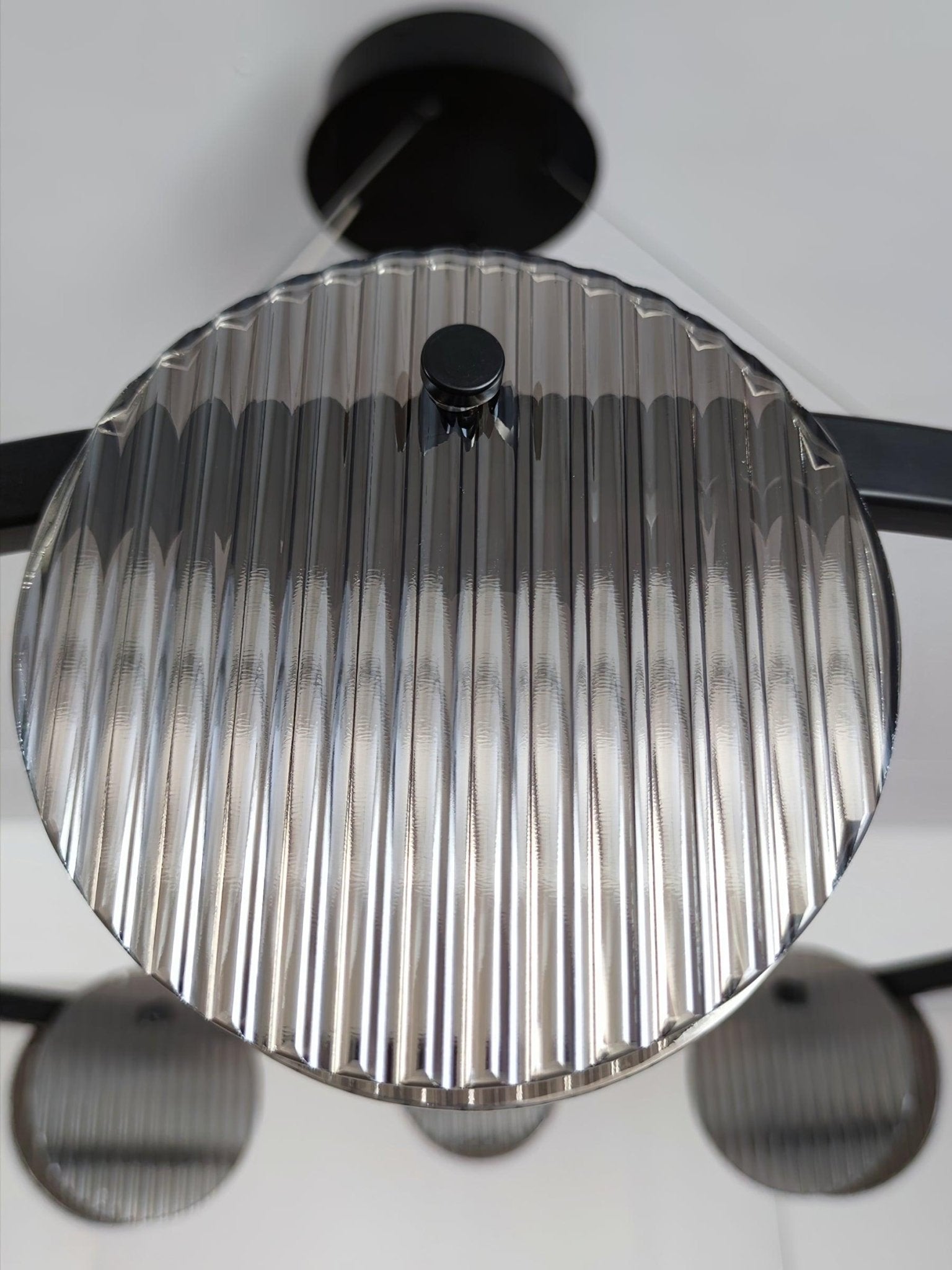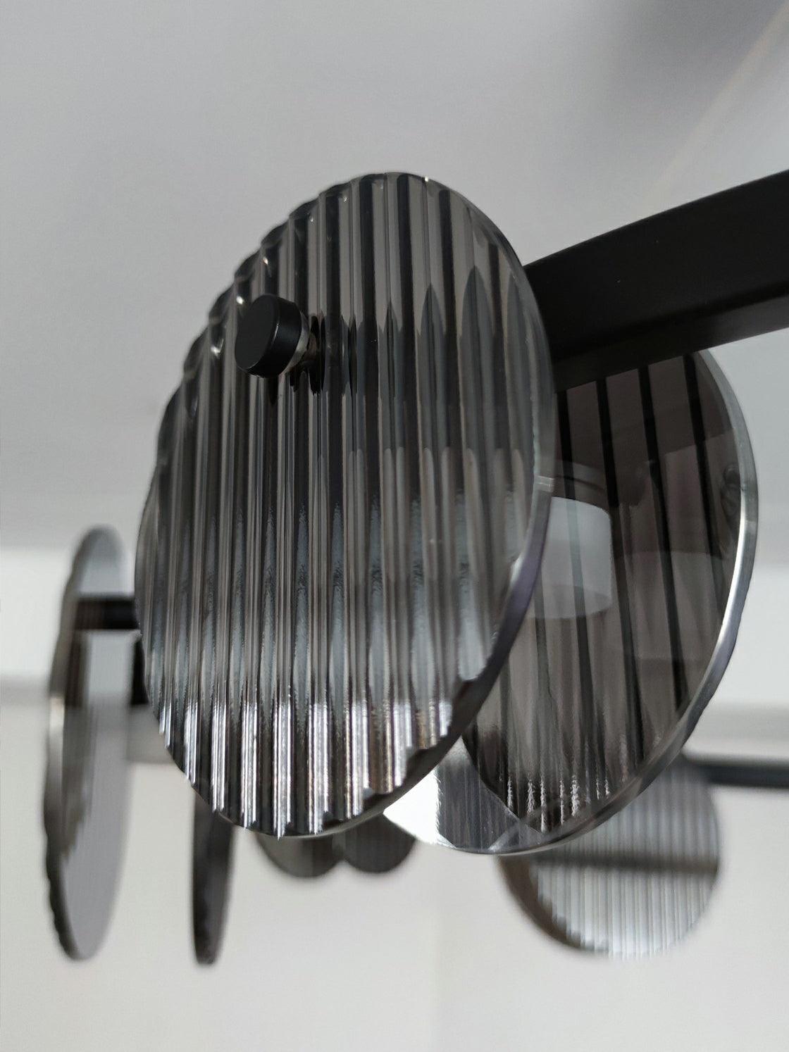 Metal channel. finished in Black. is meticulously formed in a round design to create a unique and dramatic design. Smoked glass shade supported by round of black are strategically positioned to balance out the design.