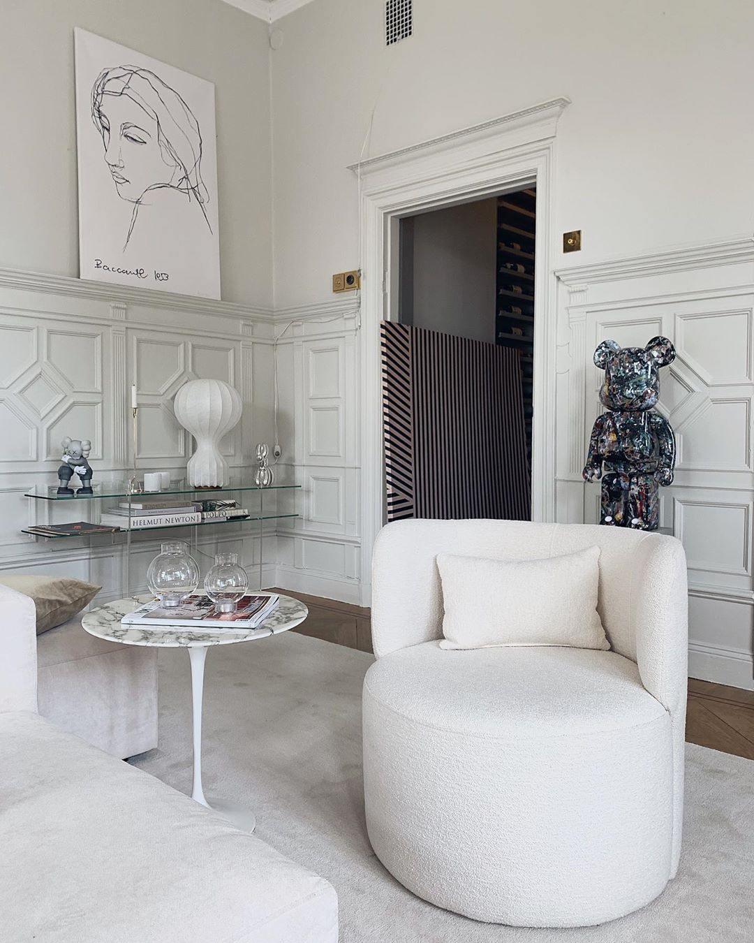 Named for a “little cat.” this Castiglioni brother's creation sits softly on any table. offering a glowing diffused light. The lamp is done in the famous “cocoon” style that the duo was known for a white powder coats the internal steel structure. which is then sprayed with the soft. webby resin. The diffuser is then protected by a transparent. sprayed-on finish.