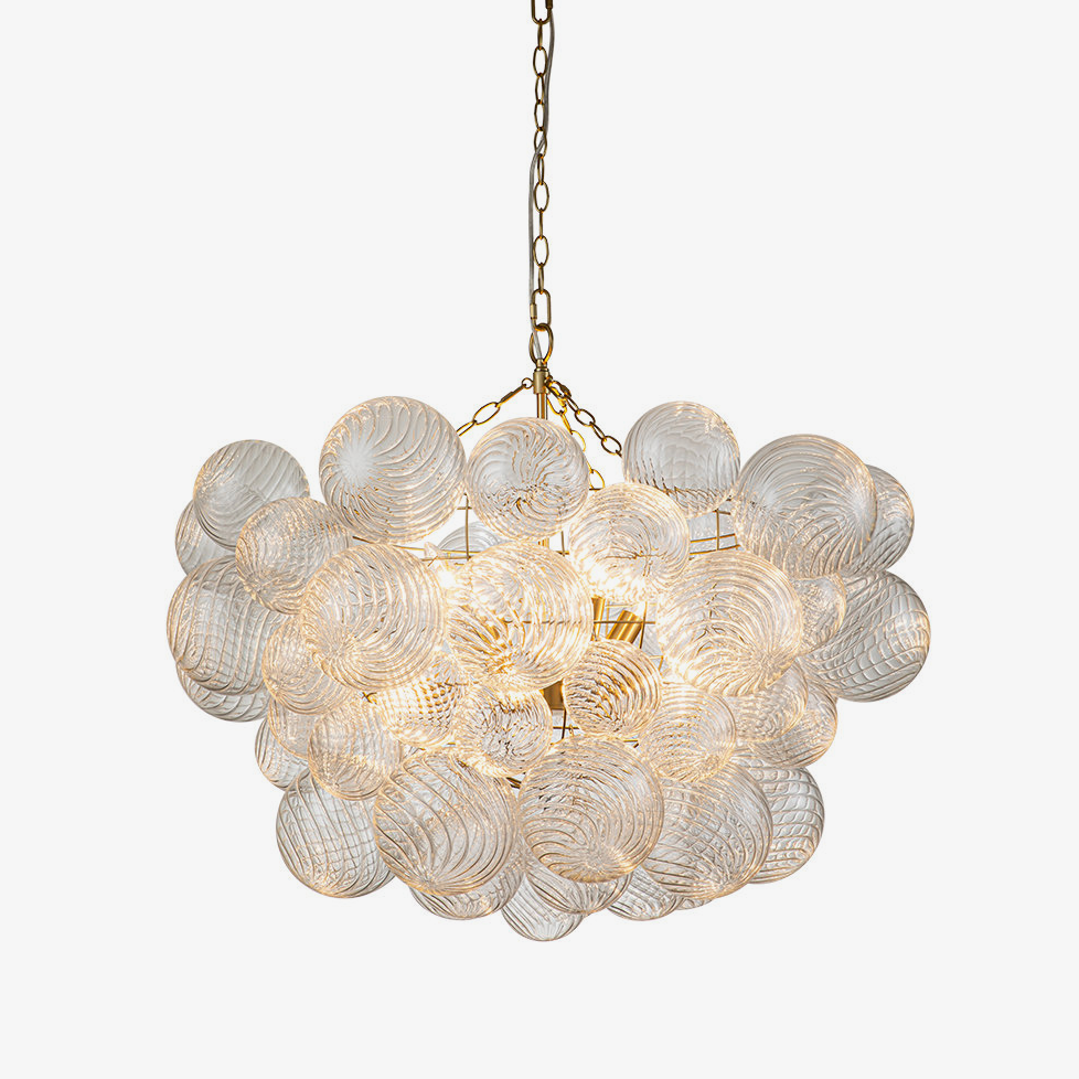 Add a touch of artistry to your living space with the Glass Ball Bubbles Chandelier. The unique circular glass shades with delicate ripple patterns create warm and gentle halos of light. The gold chain and base design exudes luxury. making this chandelier both a lighting fixture and a decorative piece. Perfect for any room. it will bring an elegant and refined touch to your home.