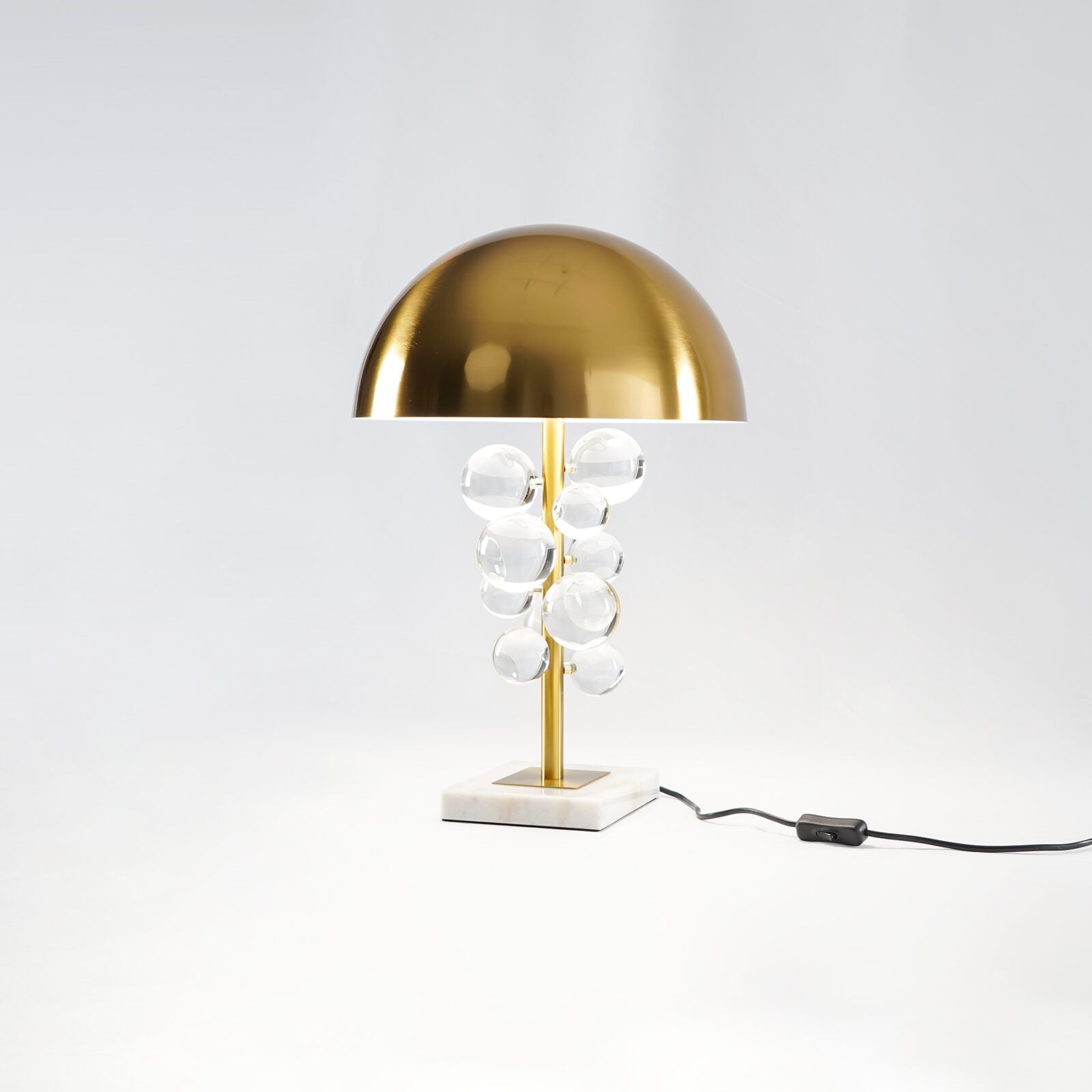 The sensational Globo Table Lamp by Vakkerlighting features a constellation of glass spheres that float on a slender Copper stem anchored by a sculptural marble base and topped with a brass dome. The dazzling shade refracts the light. makes the acrylic sparkle. and creates a lovely glow for warming your interior space.