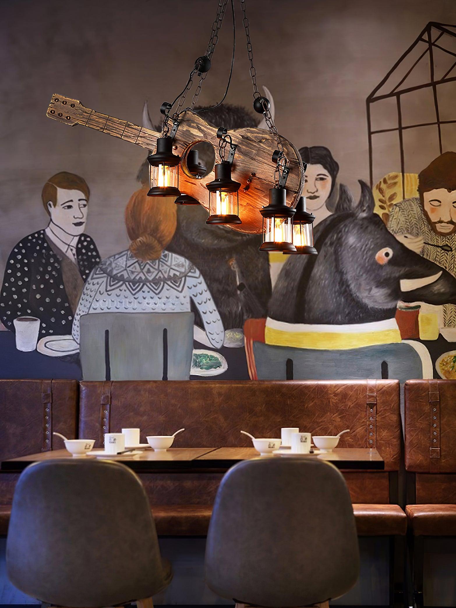 The guitar light is made of wood. metal and glass. The pendant lamp is rustic and vintage style designed. The light fixture is suitable for indoor lighting place such as bar. restaurant. dinning room.etc.