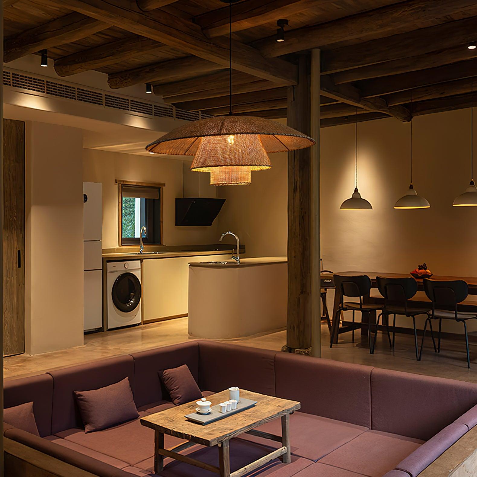 This chandelier marries the earthy texture of hand-woven rattan with the sleek durability of metal. creating a piece that's both playful and refined. The wide brim of the 'hat' is crafted from interlaced rattan. allowing light to peek through and cast a warm. mottled glow that is reminiscent of dappled sunlight through a straw hat. The metal elements provide a contemporary contrast. ensuring that the chandelier holds a sense of balance and modernity.