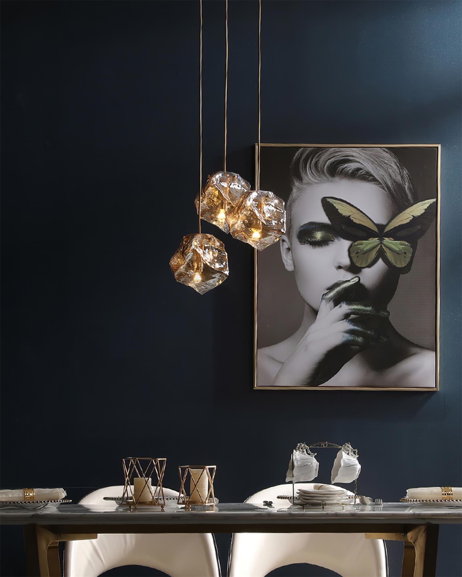 The Illyria Ice Glass Pendant Lamp is an exclusive piece that brings subtle sophistication to any setting. Crafted with distinctive mouth-blown glass. this hanging lamp features a form that is as captivating as it is enchanting. A small opening allows for a light source to be discreetly placed within. providing a glimmer of illumination that is sure to fascinate.