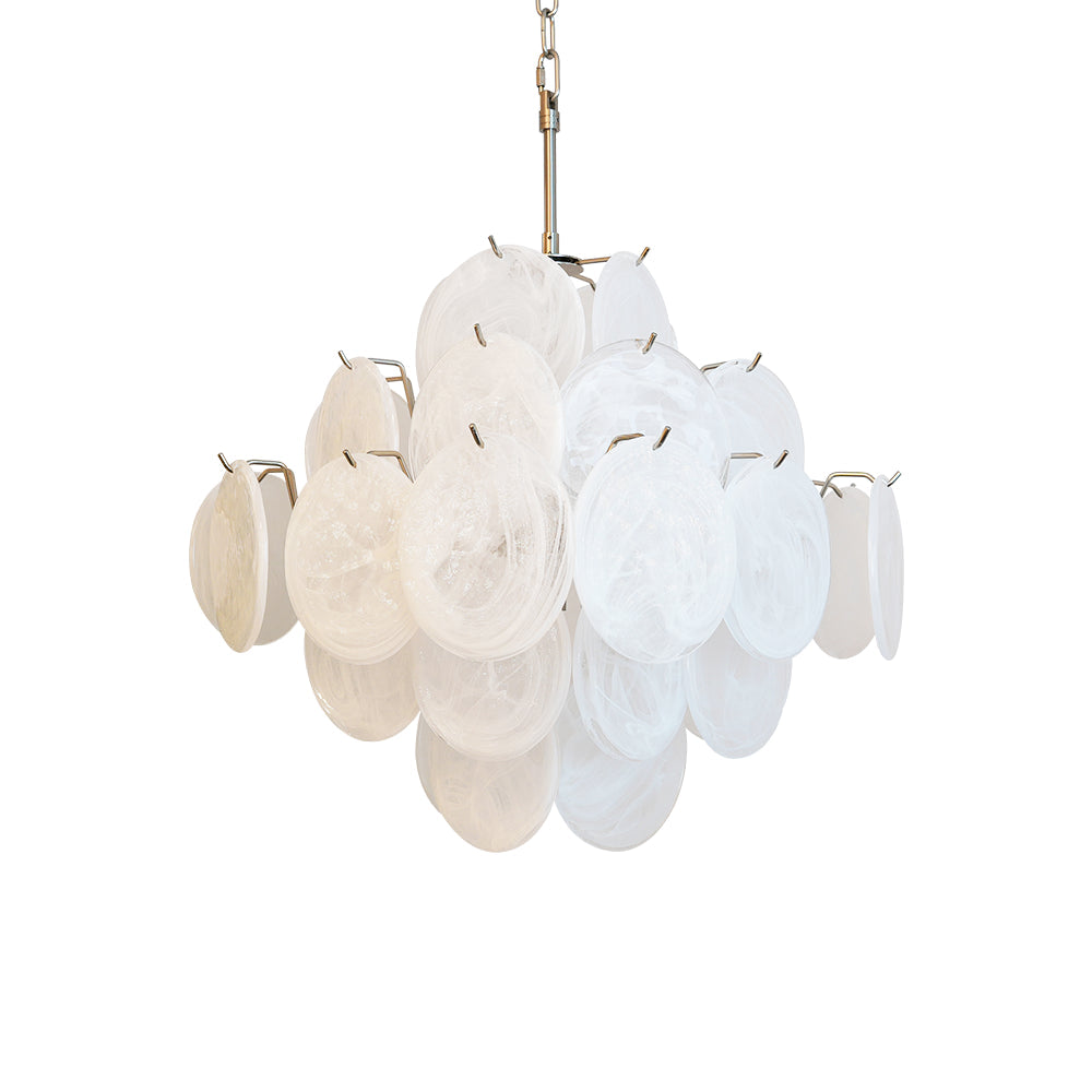 Transform your space with our Isadora Murano White Disc Chandelier. Crafted with vintage Murano White discs in a nickel metal frame. this stunning lighting fixture brightens and elevates any room. Experience sophistication and elegance while creating an enchanting and illuminating atmosphere.