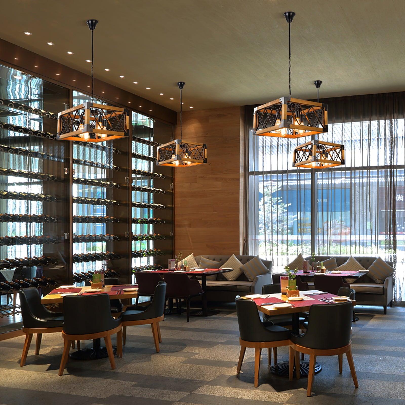 The perfect combination of wood and metal to create a unique modern farmhouse style. Hanging directly this charming 5-light island light fixture over your dining table or kitchen island . bright lighting. With Oak wood. The kitchen island chandelier light is durable and beautiful. With 5 bulbs (not included ). this pendant light can illuminate your space with it's bright but warm light. Made with a rectangular wooden cage shape shade. it is not only your industrial kitchen island pendant lighting. but also an ornament for your home table.