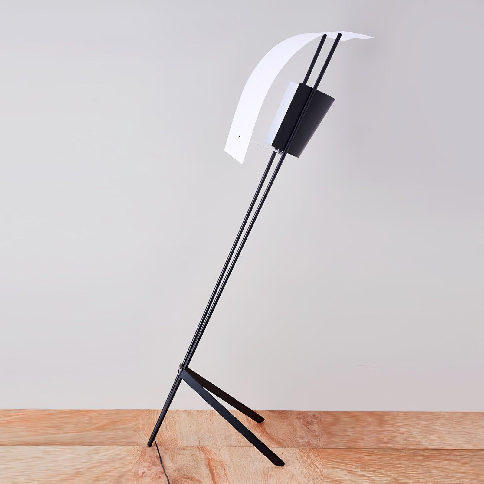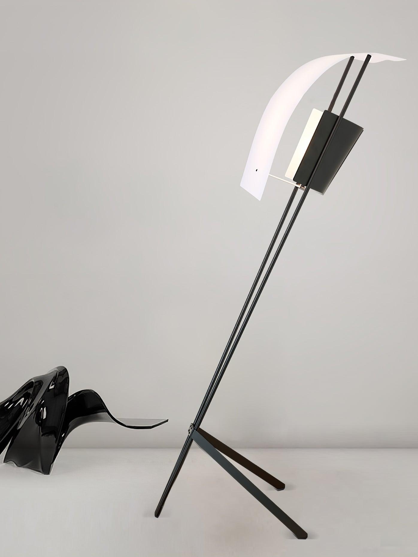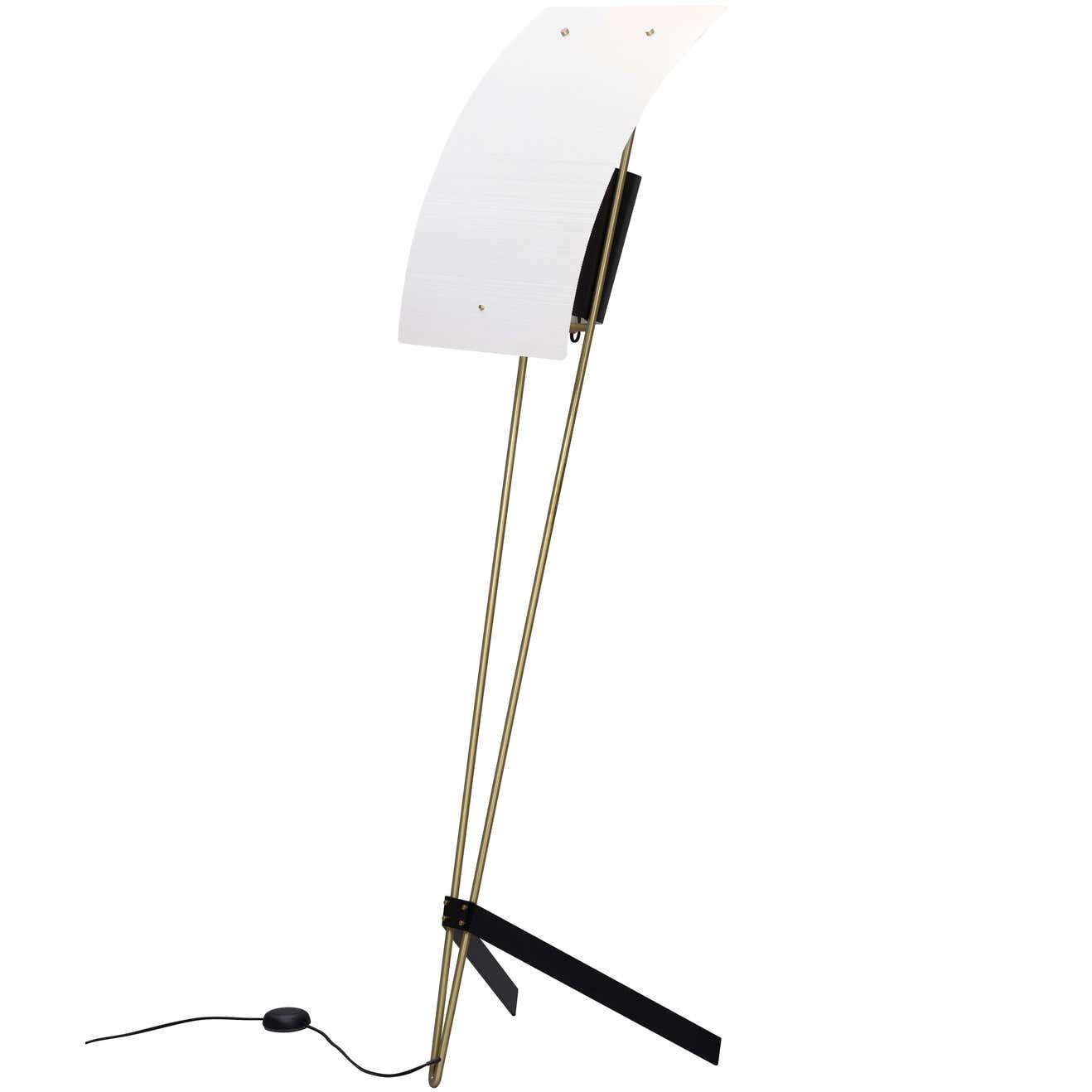 Sculptural yet delicate. this stunning floor lamp features a shimmering oval-shaped diffuser made of hand-hammered brass balanced on a tripod metal base finished in stainless steel. Placed on a slender stem cutting across the center of the lampshade. a slightly curved rectangular strip houses the light source. casting vibrant. rippled reflections evoking water.