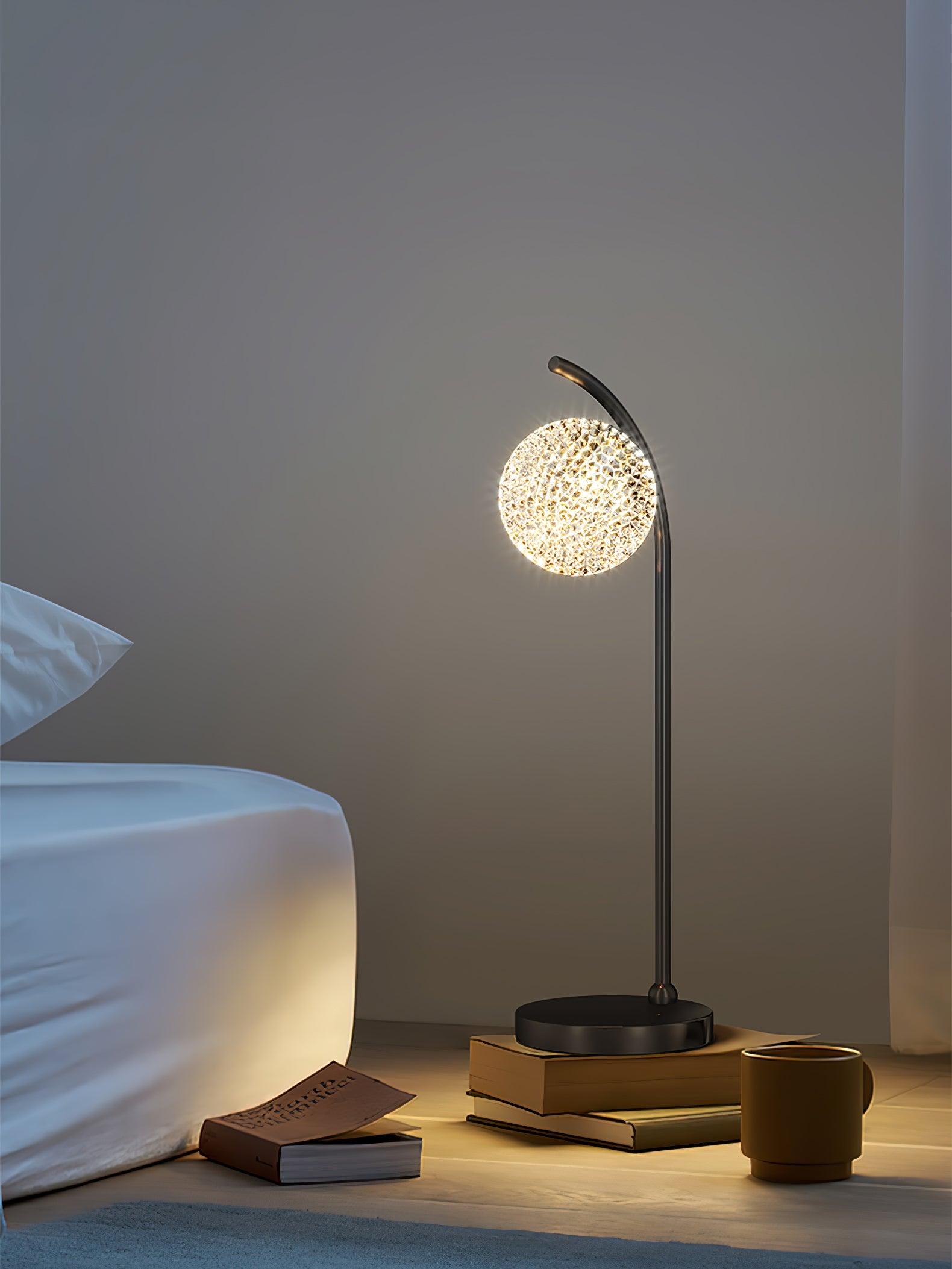 Reminiscent of a delicate dandelion puff. our table lamp is fitted with a multitude of wire arms that burst forth from the center. each supporting a small faceted crystal to sparkle day and night.