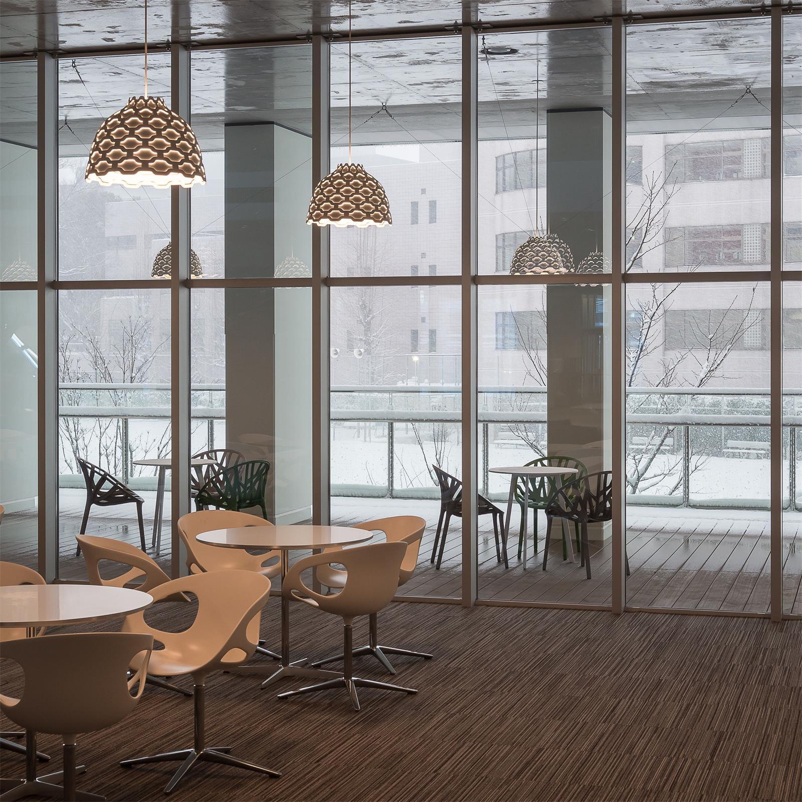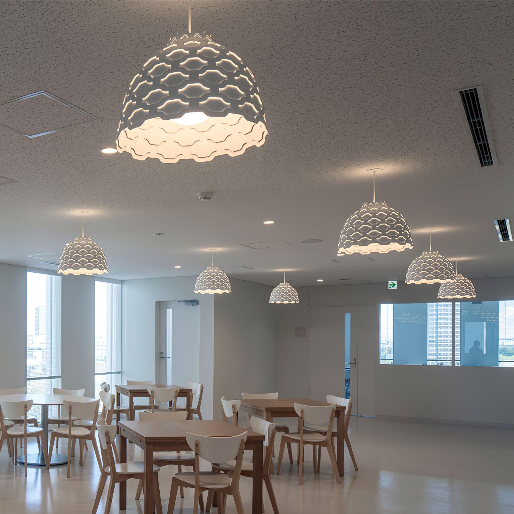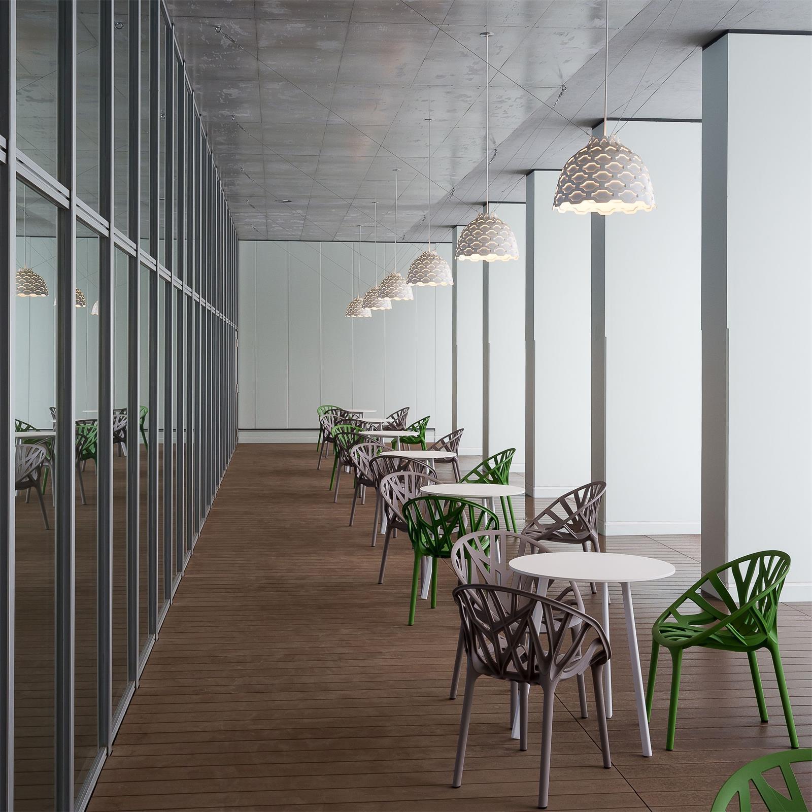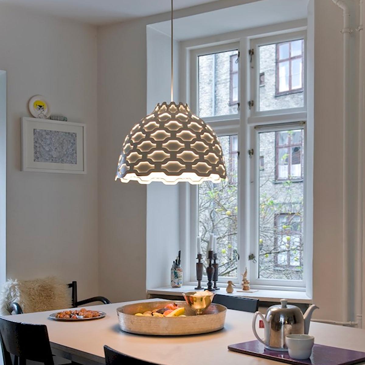 The LC Shutters is an atmospheric pendant lamp with a high light output. The lamp mainly radiates light downwards. which is softened by the diffuser so that the light is 100% glare-free. The rest of the light seeps through the small openings of the LC Shutters lamp and thus decorates the room.