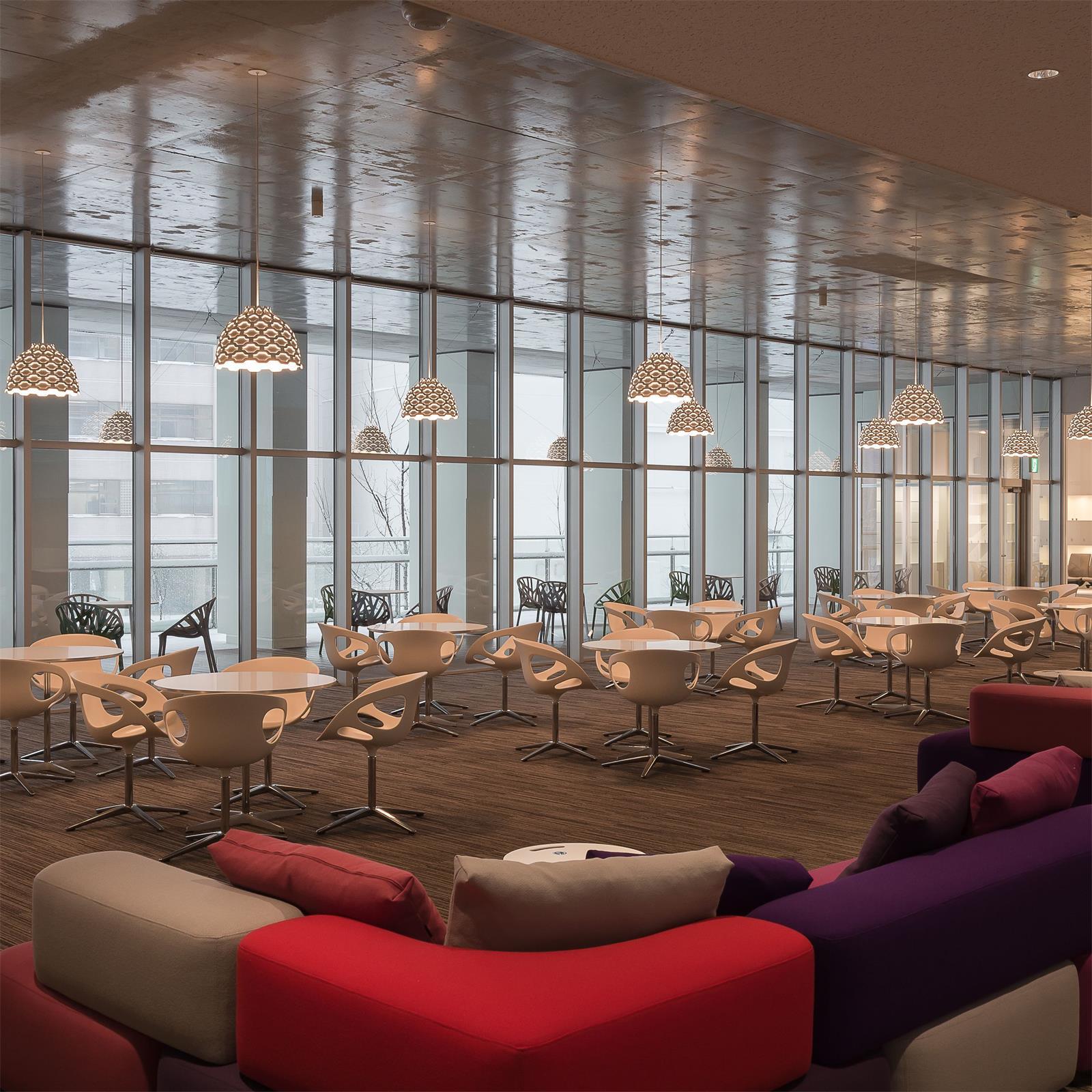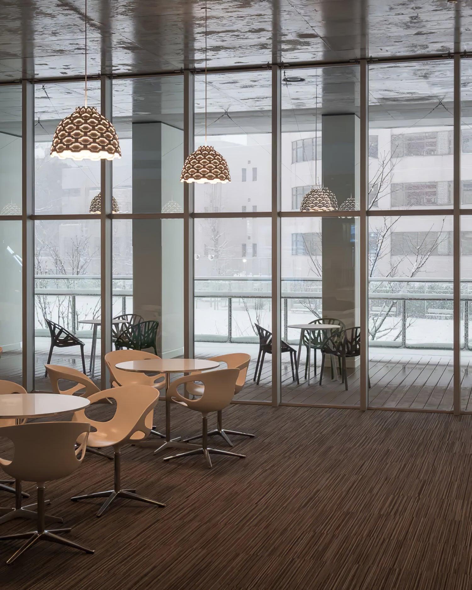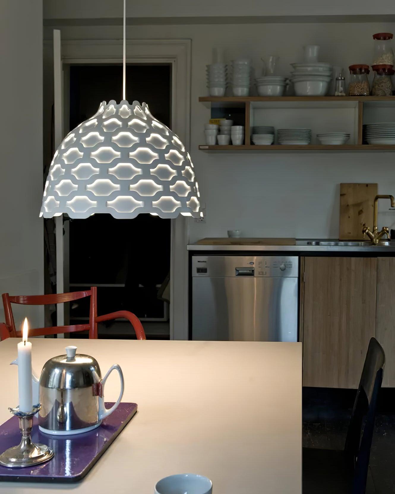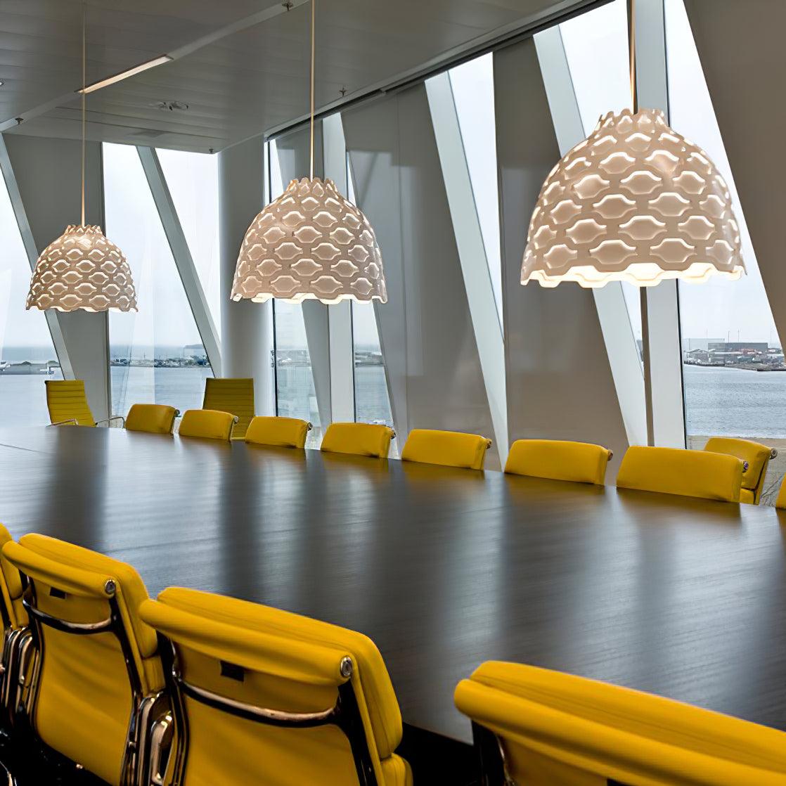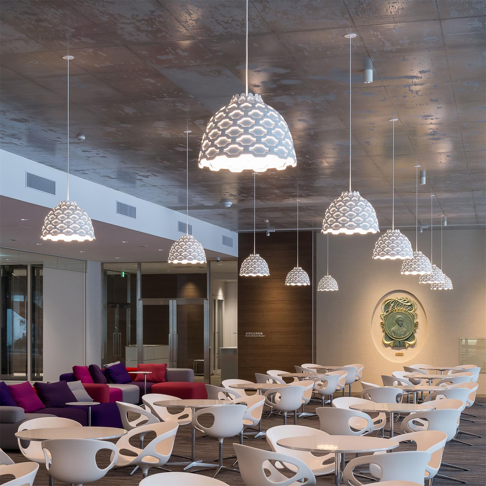 The LC Shutters is an atmospheric pendant lamp with a high light output. The lamp mainly radiates light downwards. which is softened by the diffuser so that the light is 100% glare-free. The rest of the light seeps through the small openings of the LC Shutters lamp and thus decorates the room.