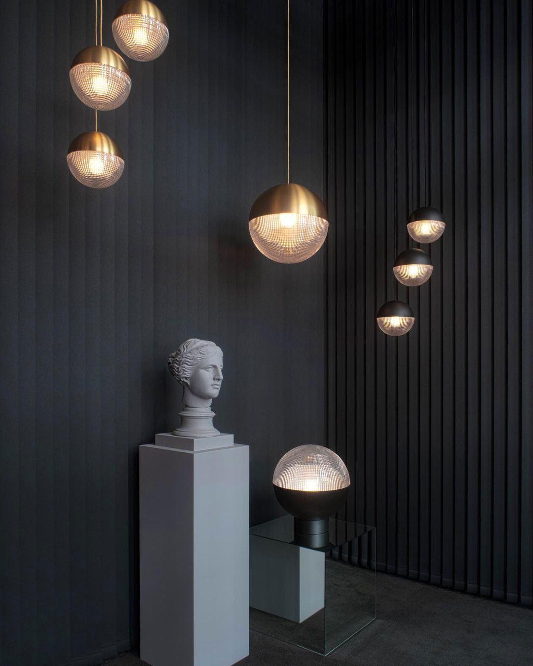 Inspired by telescopic lenses and the art of horizontal and vertical refractions. Lens Flair is a piece of two halves. seamlessly combining the solid and the transparent. A detailed cross-cut lens emits a soft deflected light. which is juxtaposed by contemporary solid casing in gold or black finishes.