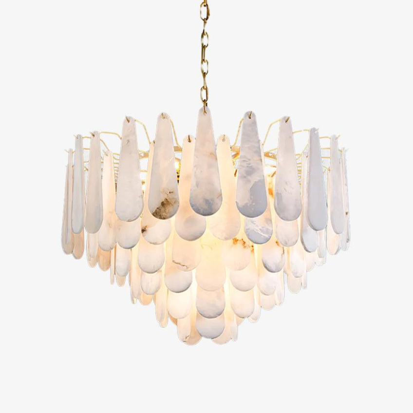 A cousin of the popular Leon the three tiers of white alabaster plates with a matching brass cover over the brass canopy. The classically elegant three-light chandelier is characterized by striking finishes and organic forms. The steel frames features an brass finish beautifully contrasting the oyster-like forms of the alabaster plates each with its own unique finish.