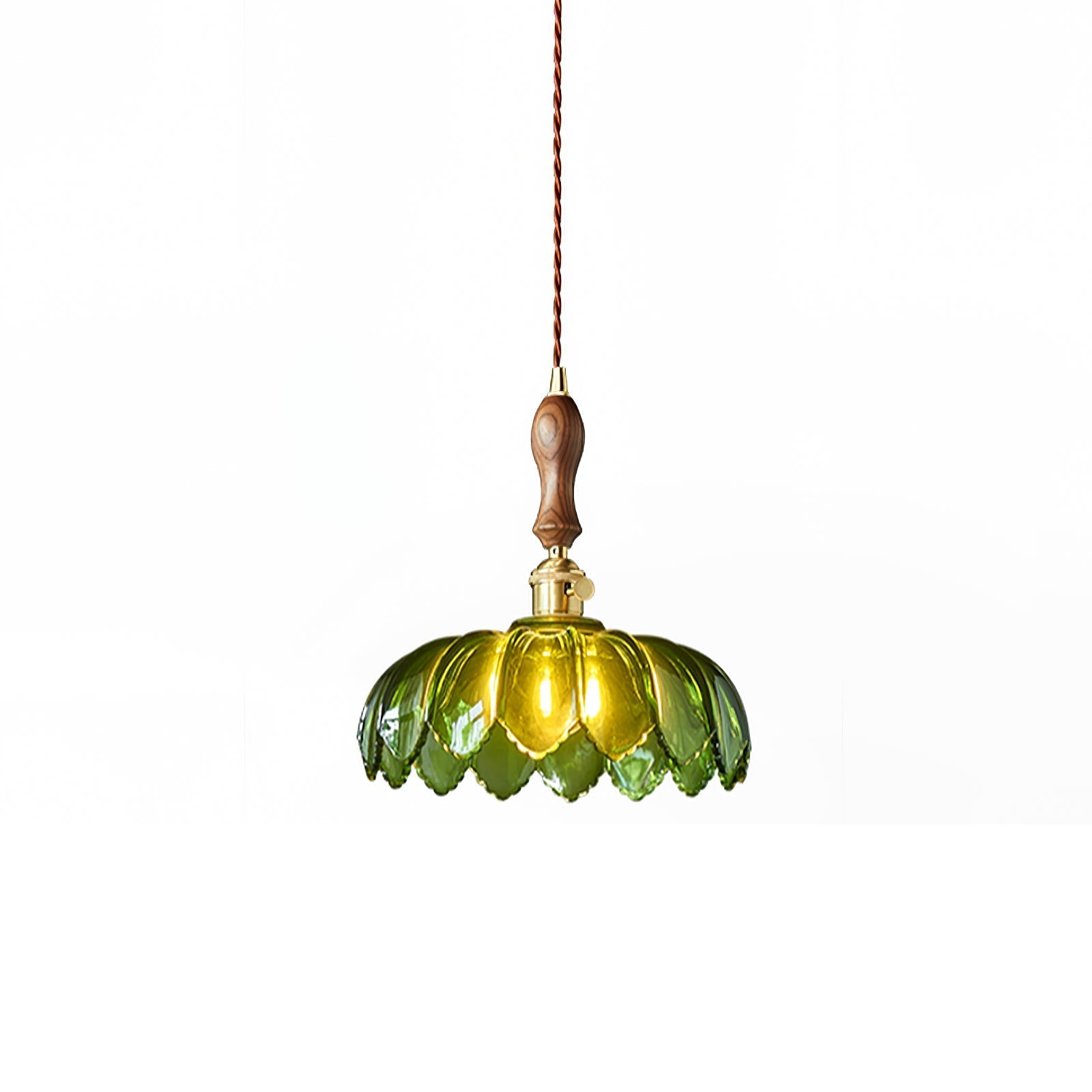 The Lila Petal Pendant Lamp exudes vintage charm with a modern twist. Its green glass shade is sculpted like delicate flower petals. while the wooden accent adds warmth. This pendant brings an artistic flair to any room. perfect for creating a soft. whimsical atmosphere.