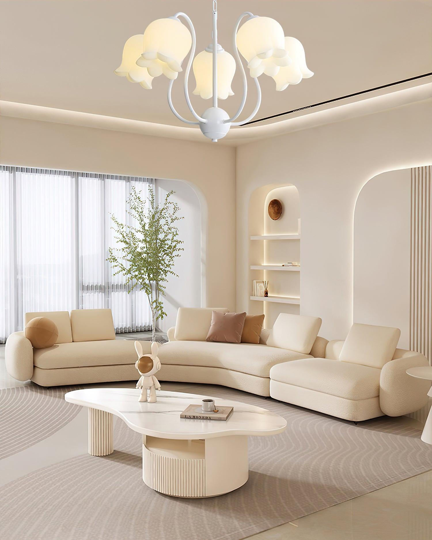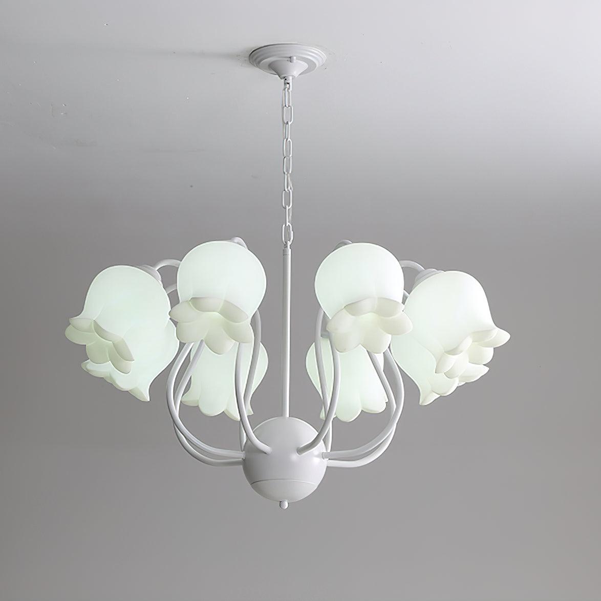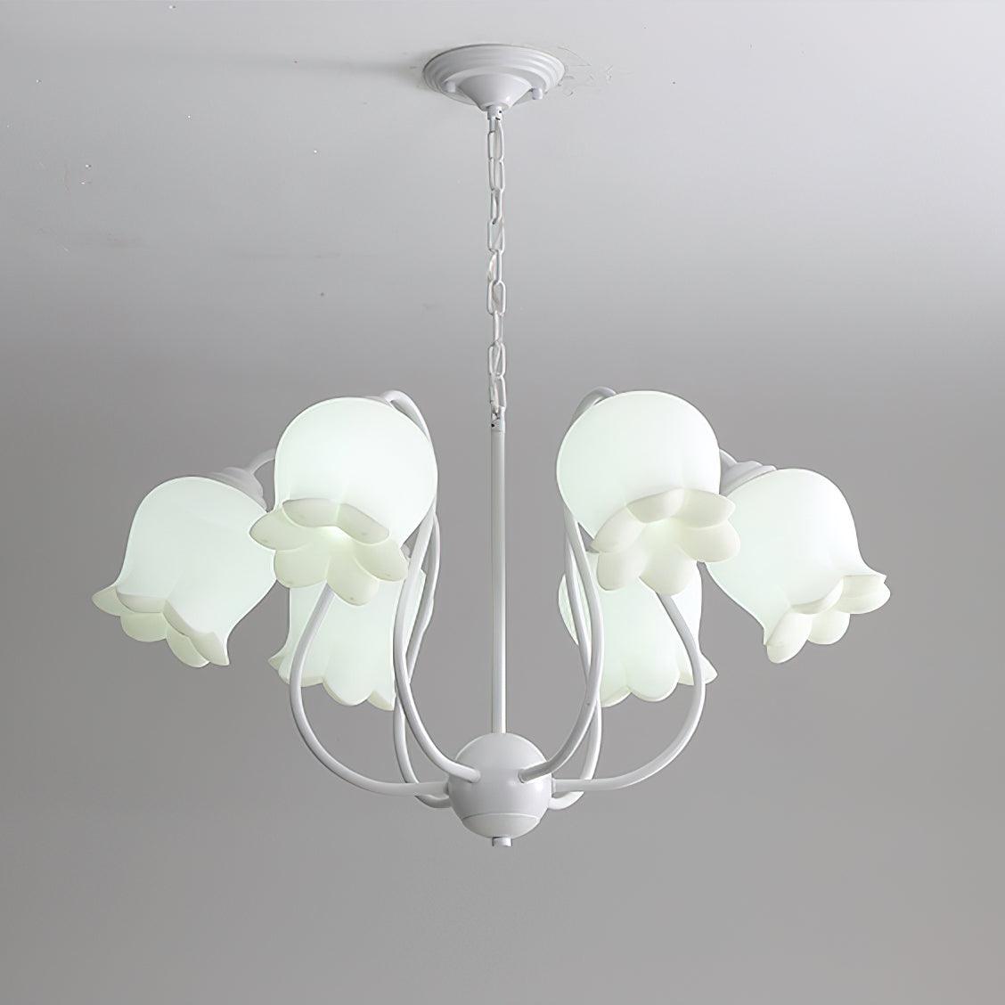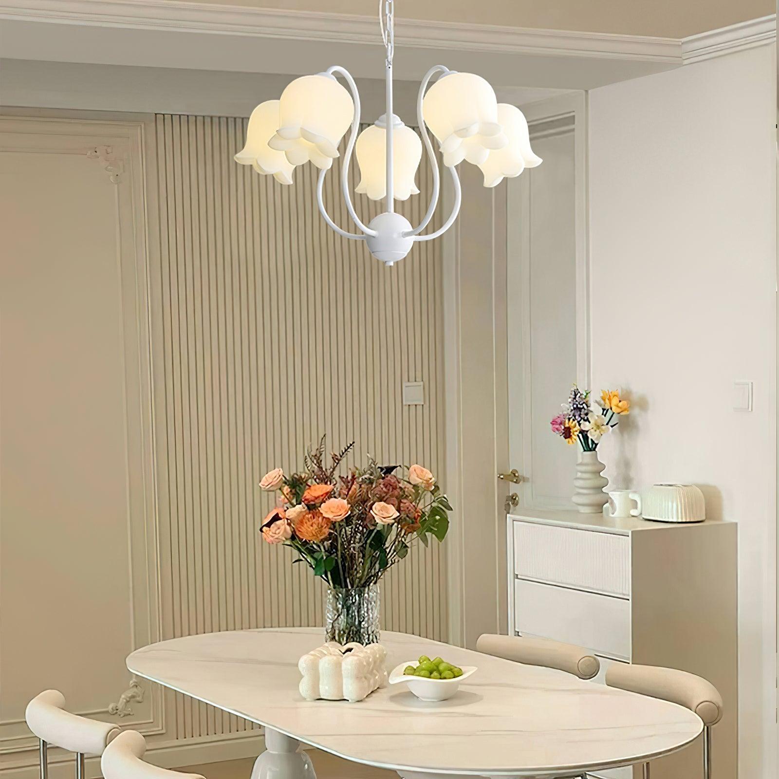 The Lilium Chandelier is a beautiful. vintage-inspired French lily-shaped pendant light with a matte PE lampshade in a garland-style design. Its sophisticated style is perfect for adding a touch of French countryside charm to any room.
