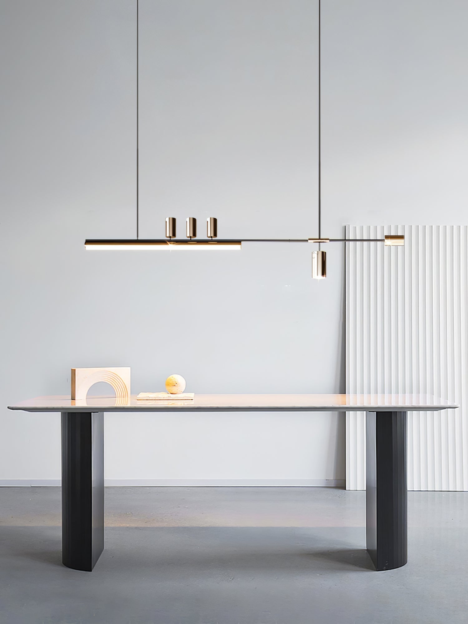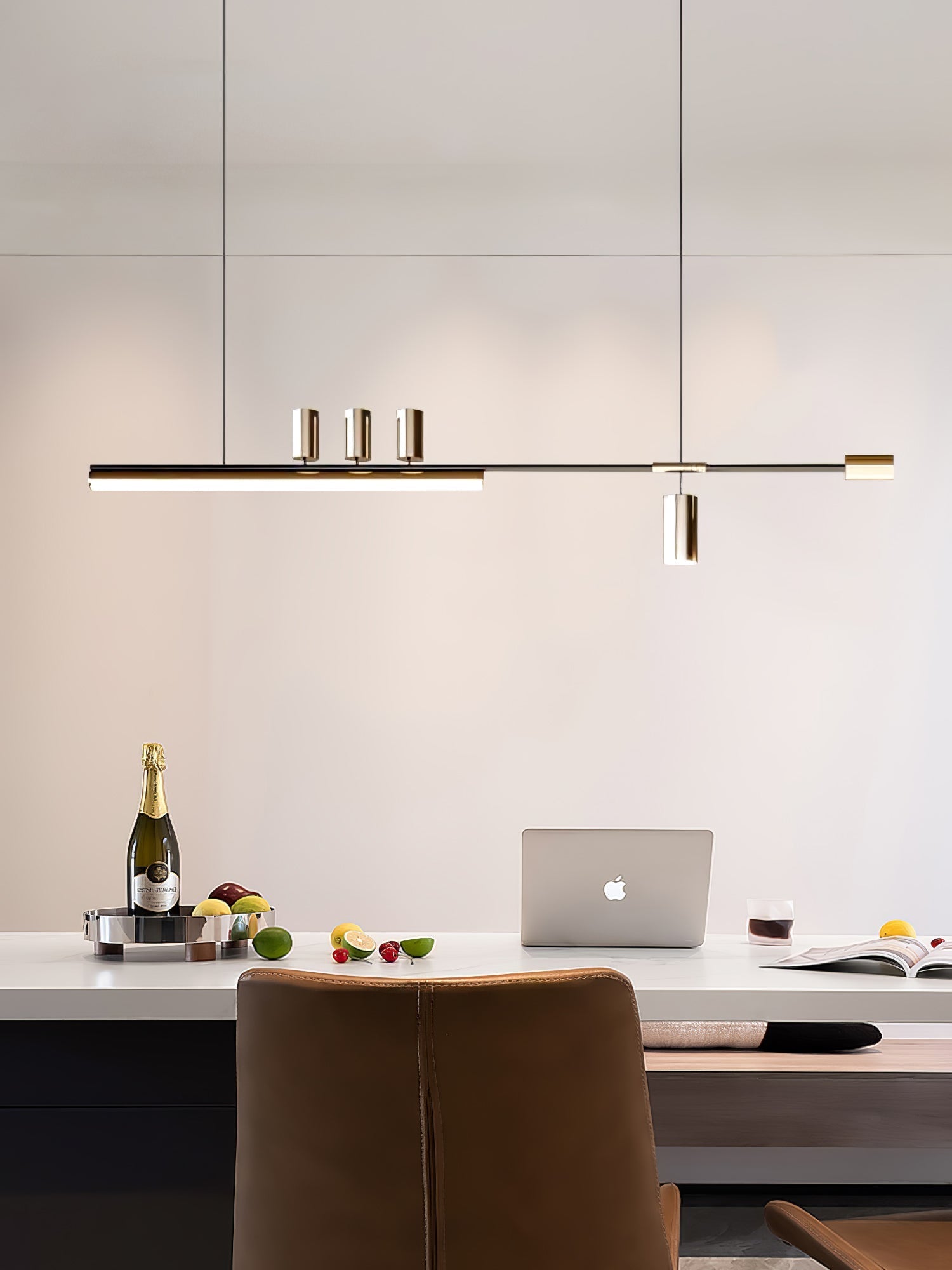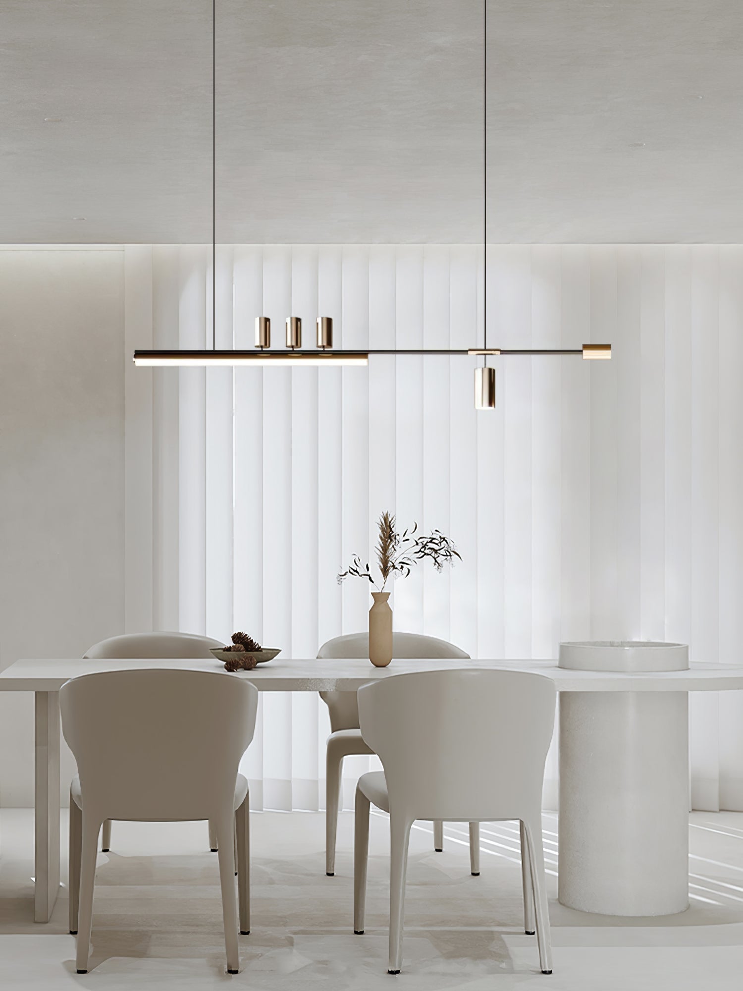 The Linear Elegance Pendant Lamp showcases a refined. minimalist design perfect for contemporary spaces. Its slender horizontal bar. crafted from high-quality metal with a sleek finish. supports multiple cylindrical fixtures that exude a soft. ambient light. This fixture is designed to offer both functional illumination and a touch of modern sophistication. making it ideal for placement over dining areas. kitchen islands. or office spaces. The lamp's adjustable suspension system allows for customizable heights. adapting effortlessly to any room's requirements.