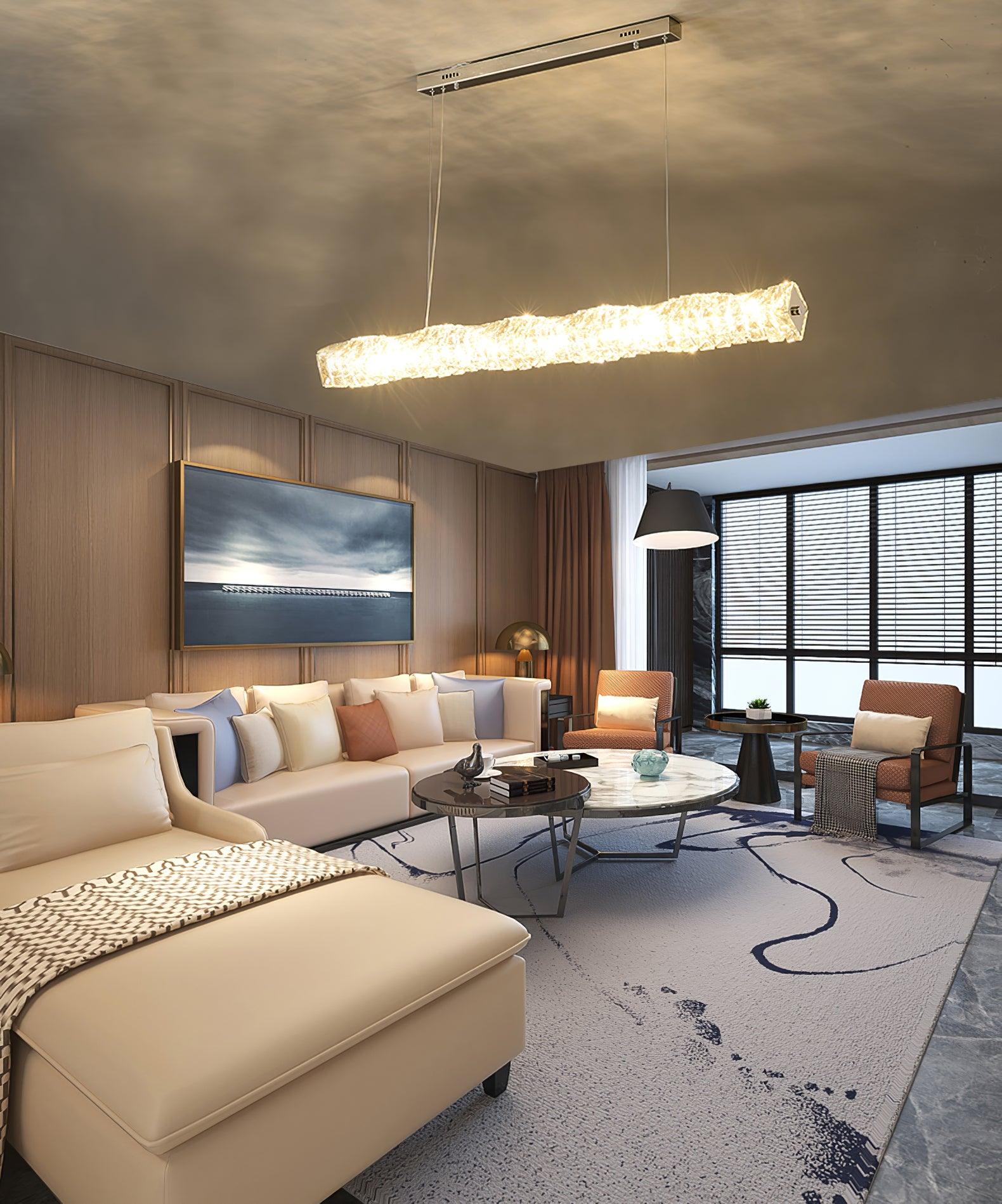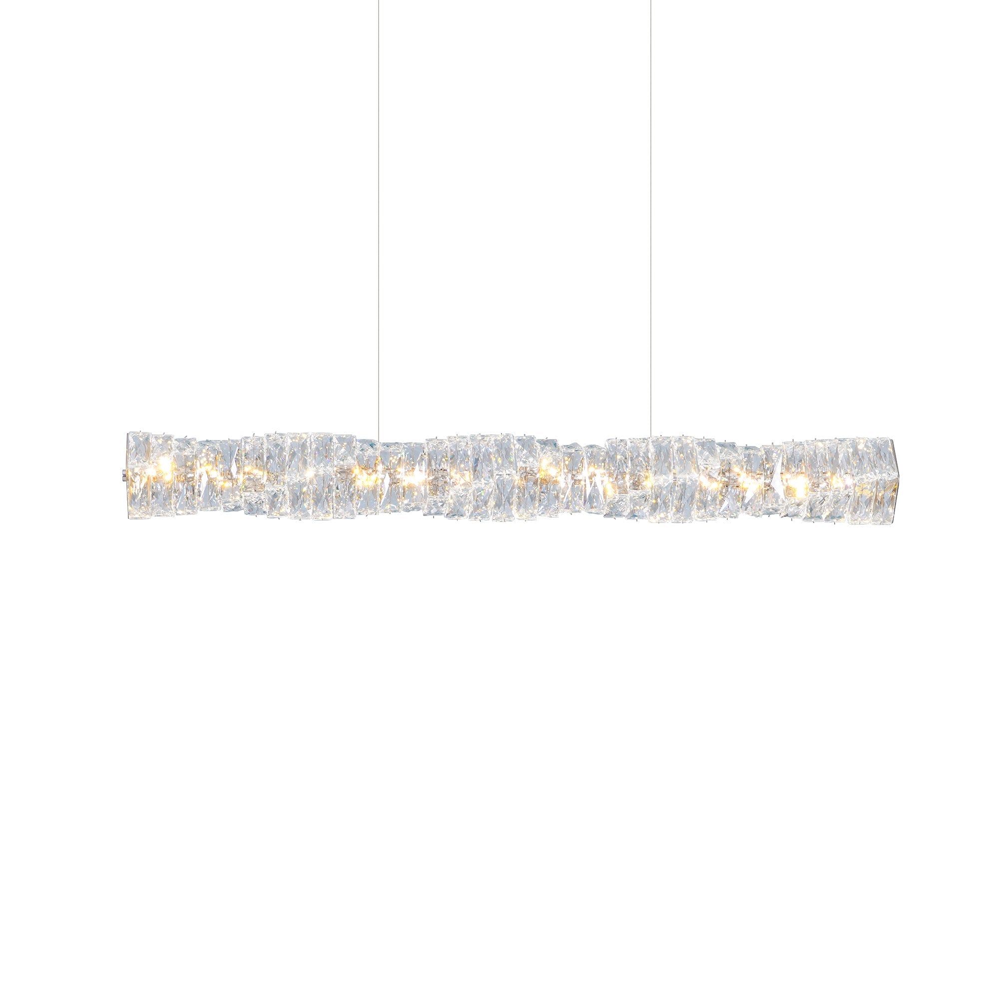 The Long Crystal Pendant Lamp is perfect for above long or rectangle tables. yet would not be out of place above a statement kitchen island. The linear shape lends itself beautifully to the function. Jewelled with K9 Crystal. which is known for the outstanding clarity of the prisms and low inclusions akin to diamonds in that regard and just as sparkly! Refracting and reflecting light.