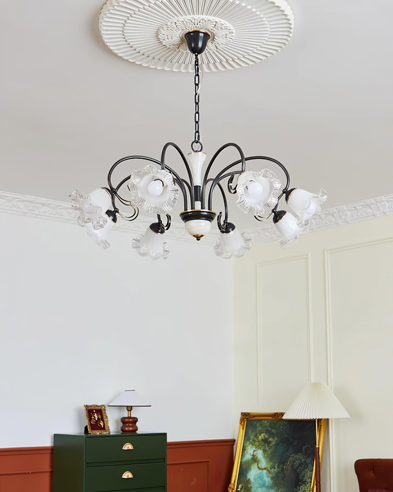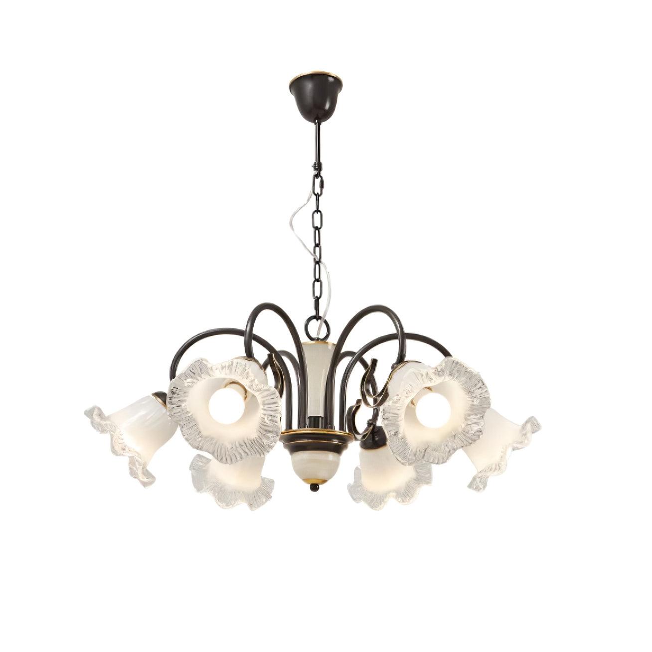 Experience the perfect blend of elegance and romance in the Luce Black Chandelier. distinguished by its vintage appeal and delicate floral shade. Create an atmosphere of refined beauty and soft sophistication with its captivating nuances. and luxuriate in a timeless ambience of warmth and serenity.