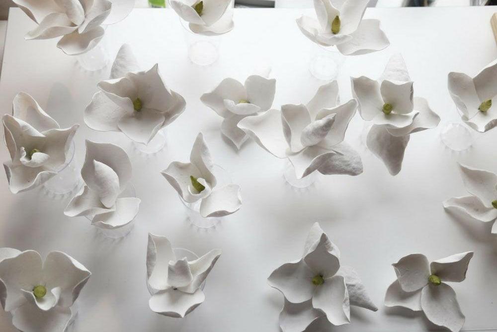 Lure uses cast cotton paper flowers sculpted by hand. Each blossom's petals are individually shaped. and each Lure blossom is unique. Unlike wood-based paper. the cotton paper is archival in quality. extremely durable. and has been known to last for more than a hundred years.