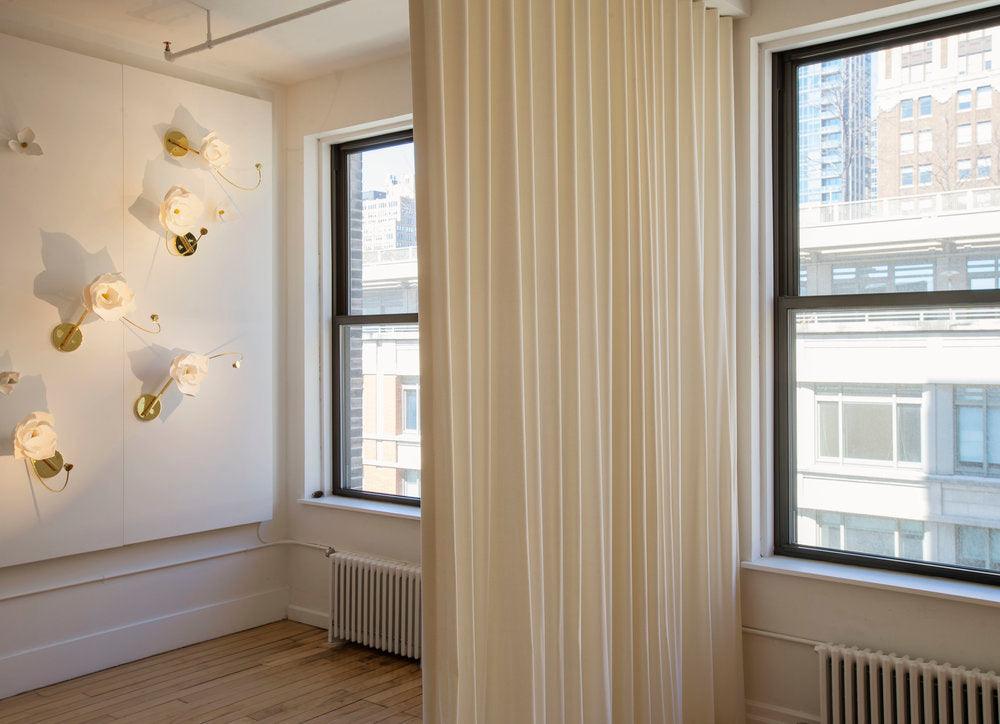 The Lure Magnolia Sconce transforms a flower's transient beauty into a lasting light. In this fixture. a cast cotton paper flower is spotlit by a suspended LED light source. Held by a slender brass arc. the light shines brightly on a blossom built of hand-sculpted petals. displaying texture. structure. and delicacy. The white flower reflects light. providing a source of soft illumination.